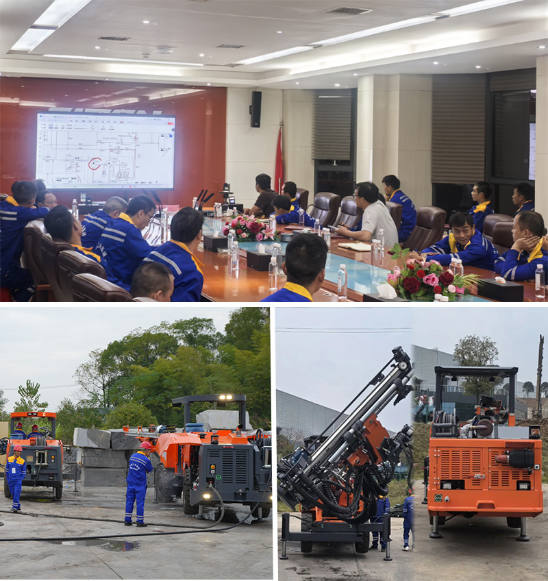 培训以“理论结合实践”的模式开展,针对江西鑫通矿用掘进钻车和矿用锚杆钻车展开教学,理论课程涵盖台车的运行原理、保养和维修知识;设备实操通过结合模拟掌子面对眼、在岩石上进行钻孔等课程,为学员提升操作技能打下了坚实的基础。