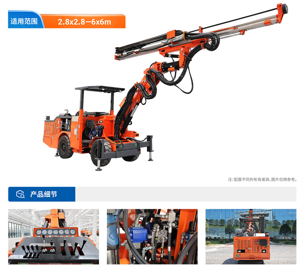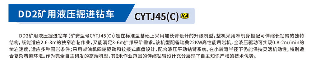 DD2矿用液压据进钻车(矿安型号CYTJ45(C)是在标准型基础上采用加长臂设计的升级机型,整机采用窄机身搭配可伸缩长钻臂的独特结构,既能适应2.6-3m的狭窄岩巷作业,又能满足3-6m扩邦采矿需求。该机型配备瑞典22KW高性能凿岩机,全波压驱动可实现0.8-2m/min的西岩速度,适应多种围岩条件;采用柴油机四轮驱动和铰接式底盘设计,配合波压平动钻臂系统,在小转弯半径下仍能保持灵活机动性,特别适合复杂巷道环境。作为完全自主研发的高端机型,其6米作业范围的伸缩钻臂设计充分展现,了自主知识产权的技术优势。