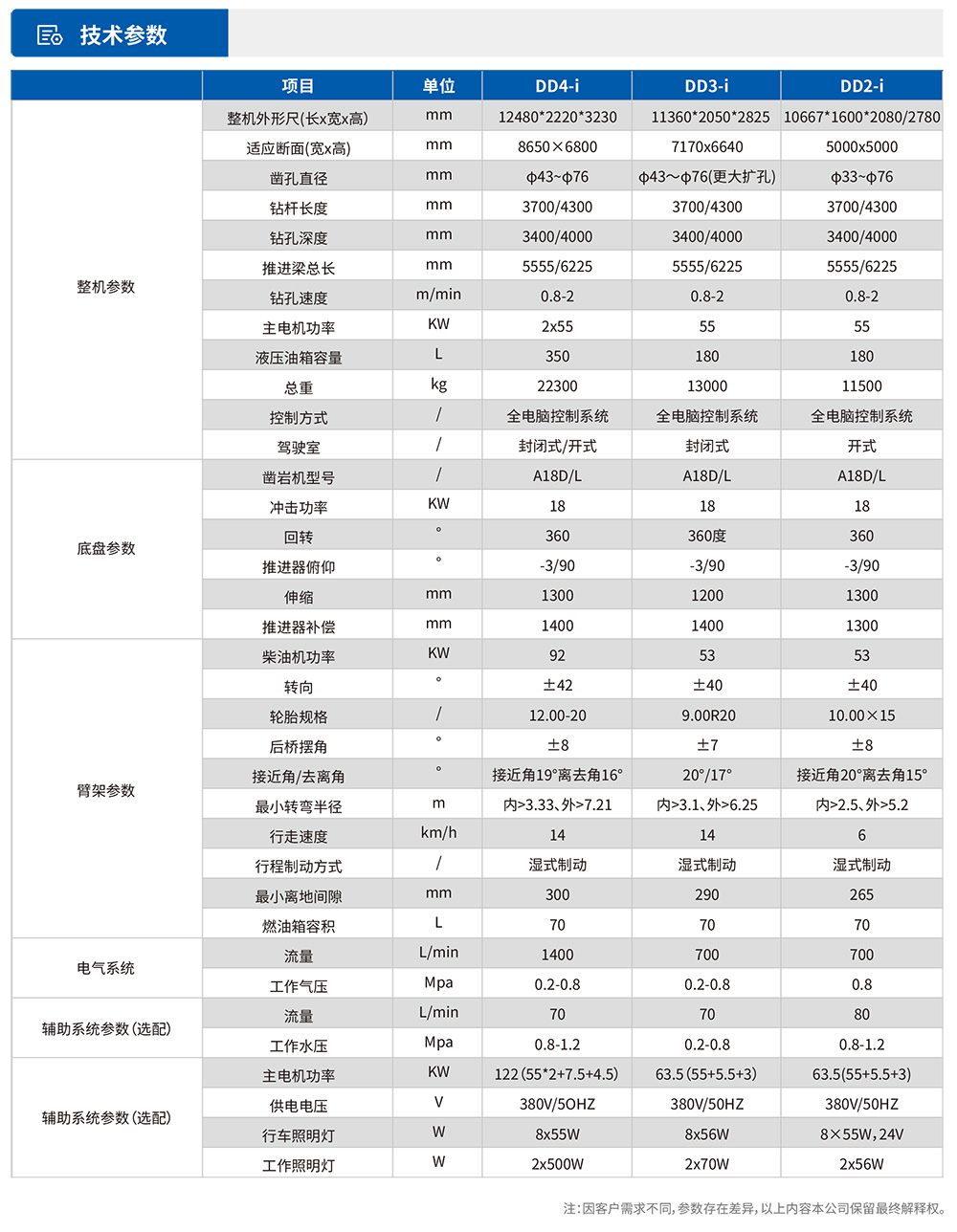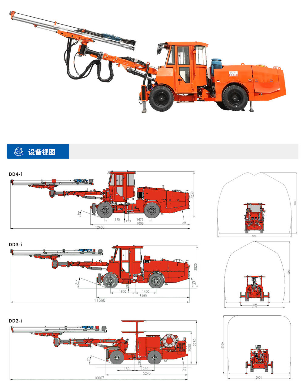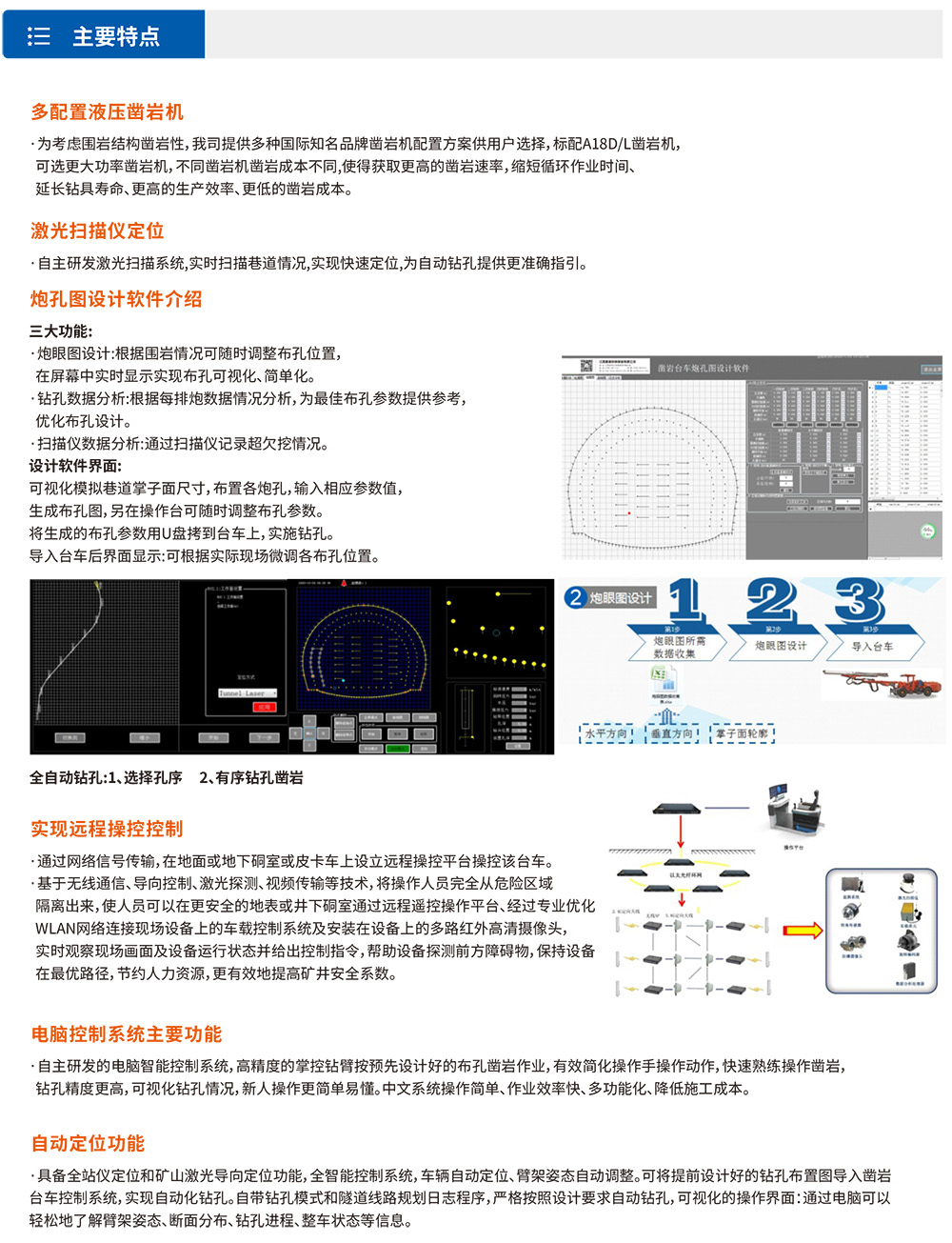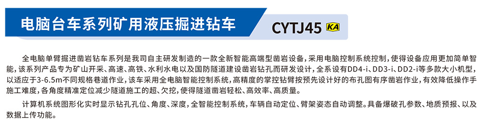全电脑单臂掘进凿岩钻车系列是我司自主研发制造的一款全新智能高端型凿岩设备,采用电脑控制系统控制,使得设备应用更加简单智能,该系列产品专为矿山开采、高速、高铁、水利水电以及国防隧道建设凿岩钻孔而研发设计,全系设有DD4-iDD3-iDD2-i等多款大小机型,以适应于3-6.5m不同规格巷道作业,该车采用全电脑智能控制系统,高精度的掌控钻臂按预先设计好的布孔图有序凿岩作业,有效降低操作手施工难度,各角度精准定位减少隧道施工的超、欠挖,使得隧道凿岩轻松、高效率、高质量。计算机系统图形化实时显示钻孔孔位、角度、深度,全智能控制系统,车辆自动定位、臂架姿态自动调整。具备爆破孔参数、地质预报、以及数据上传功能。