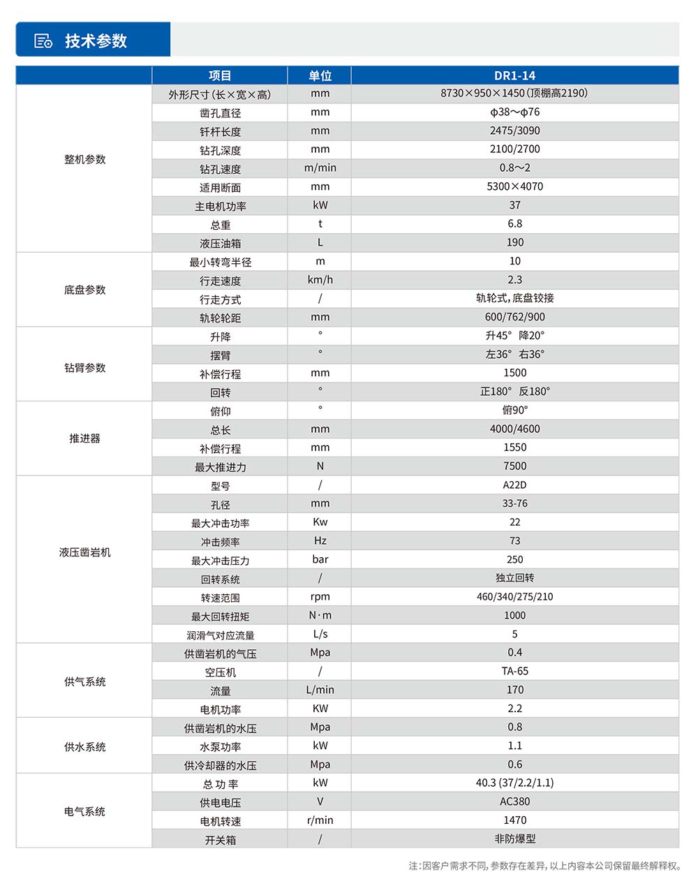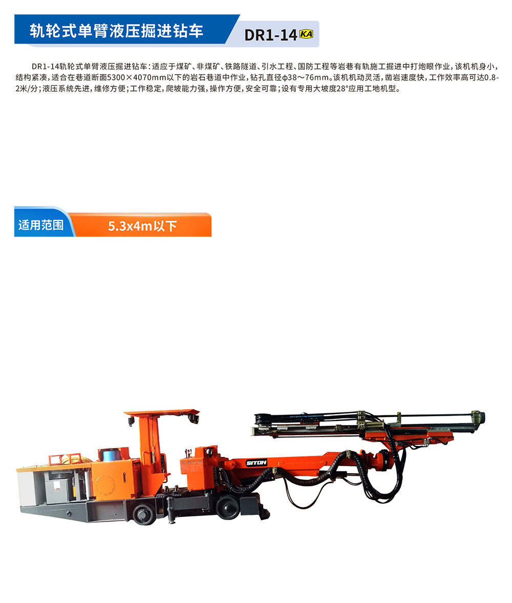 DR1-14轨轮式单臂液压掘进钻⻋:适应于煤矿、⾮煤矿、铁路隧道、引⽔⼯程、国防⼯程等岩巷有轨施⼯掘进中打炮眼作业,该机机⾝⼩,结构紧凑,适合在巷道断⾯5300×4070mm以下的岩⽯巷道中作业,钻孔直径φ38〜76mm。该机机动灵活,凿岩速度快,⼯作效率⾼可达0.8-2⽶/分;液压系统先进,维修⽅便;⼯作稳定,爬坡能⼒强,操作⽅便,安全可靠;设有专⽤⼤坡度28°应⽤⼯地机型。
