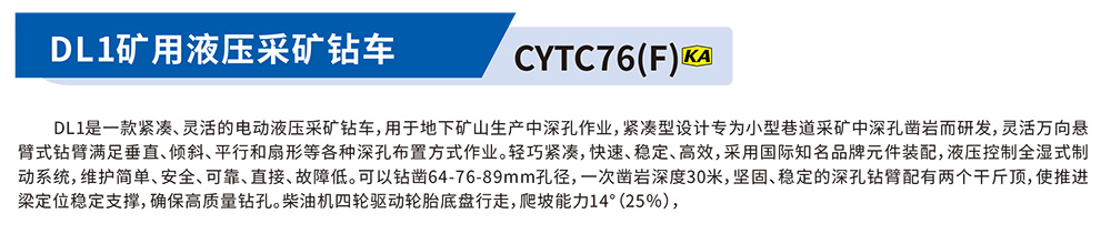 DL1是一款紧凑、灵活的电动液压采矿钻车,用于地下矿山生产中深孔作业,紧凑型设计专为小型巷道采矿中深孔凿岩而研发,灵活万向悬臂式钻臂满足垂直、倾斜、平行和扇形等各种深孔布置方式作业。轻巧紧凑,快速、稳定、高效,采用国际知名品牌元件装配,液压控制全湿式制动系统,维护简单、安全、可靠、直接、故障低。可以钻凿64-76-89mm孔径,一次凿岩深磨30米,坚因、稳定的深孔钻臂配有两个干斤顶,使推进梁定位稳定支撑,确保高质量钻孔。柴油机四轮驱动轮胎底盘行走,爬坡能力14°(25 %6),