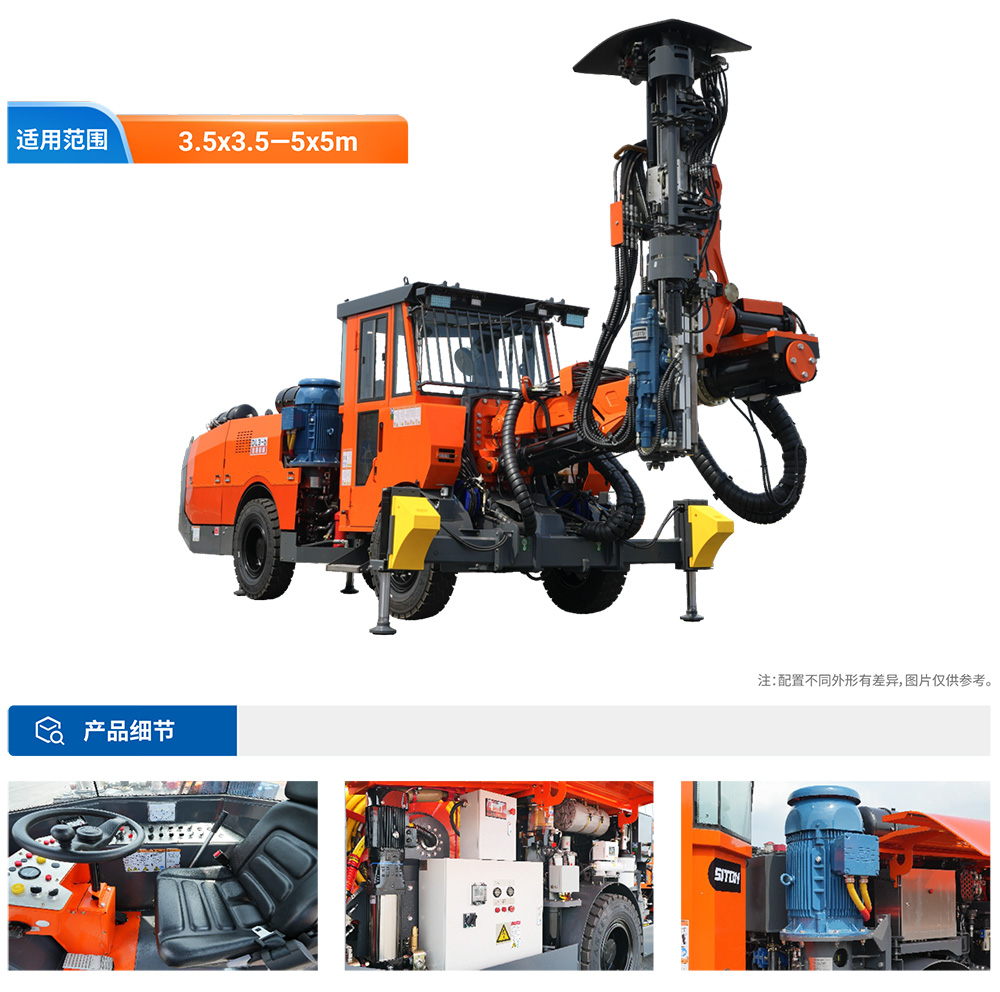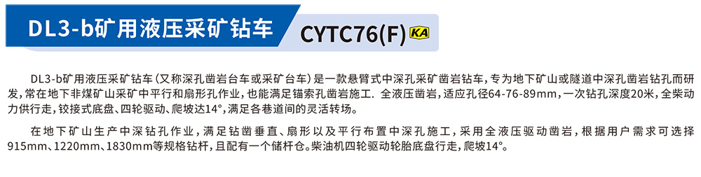 DL3-b矿用液压采矿钻车(又称深孔凿岩台车或采矿台车)是一款悬臂式中深孔采矿凿岩钻车,专为地下矿山或隧道中深孔凿岩钻孔而研发,常在地下非煤矿山采矿中平行和扇形孔作业,也能满足锚索孔凿岩施工,全液压凿岩,适应孔径64-76-89mm,一次钻孔深度20米,全柴动力供行走,铰接式底盘、四轮驱动、爬坡达14°,满足各巷道间的灵活转场。在地下矿山生产中深钻孔作业,满足钻凿垂直、扇形以及平行布置中深孔施工,采用全液压驱动凿岩,根据用户需求可选择915mm、1220mm、1830mm等规格钻杆,且配有一个储杆仓。柴油机四轮驱动轮胎底盘行走,爬坡14°。
