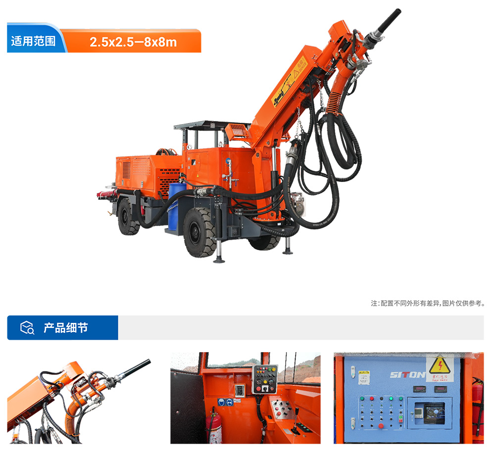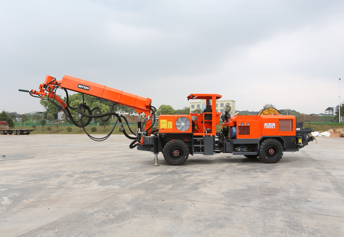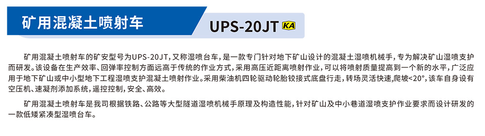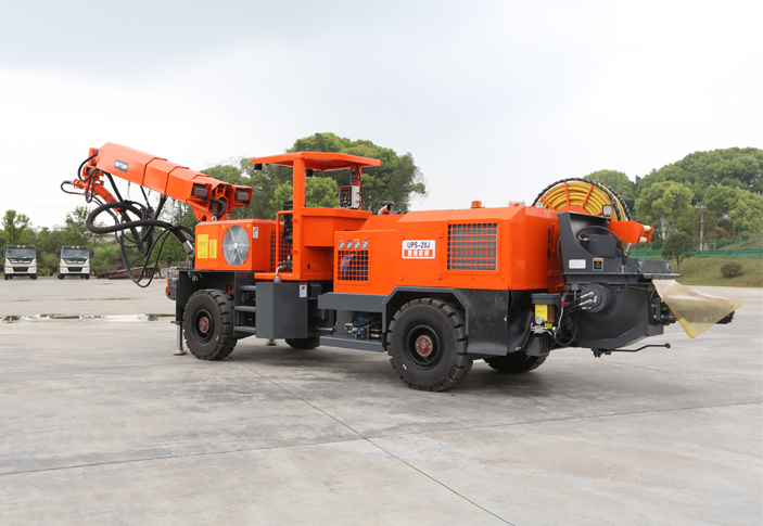 矿用混凝土喷射车的矿安型号为UPS-20JT,又称湿喷台车,是一款专门针对地下矿山设计的混凝土湿喷机械手,专为解决矿山湿喷支护而研发。该设备在生产效率、回弹率控制方面远高于传统的作业方式,采用高压近距离喷射作业,可以将喷射质量提高到一个新的水平,广泛应用于地下矿山或中小型地下工程湿喷支护混凝土喷射作业。采用柴油机四轮驱动轮胎铰接式底盘行走,转场灵活快速,爬坡<20”,该车自身设有空压机、速凝剂添加系统,遥控控制,安全、高效。矿用混凝土喷射车是我司根据铁路、公路等大型隧道湿喷机械手原理及构造性能,针对矿山及中小巷道湿喷支护作业要求而设计研发的款低矮紧凑型湿喷台车。