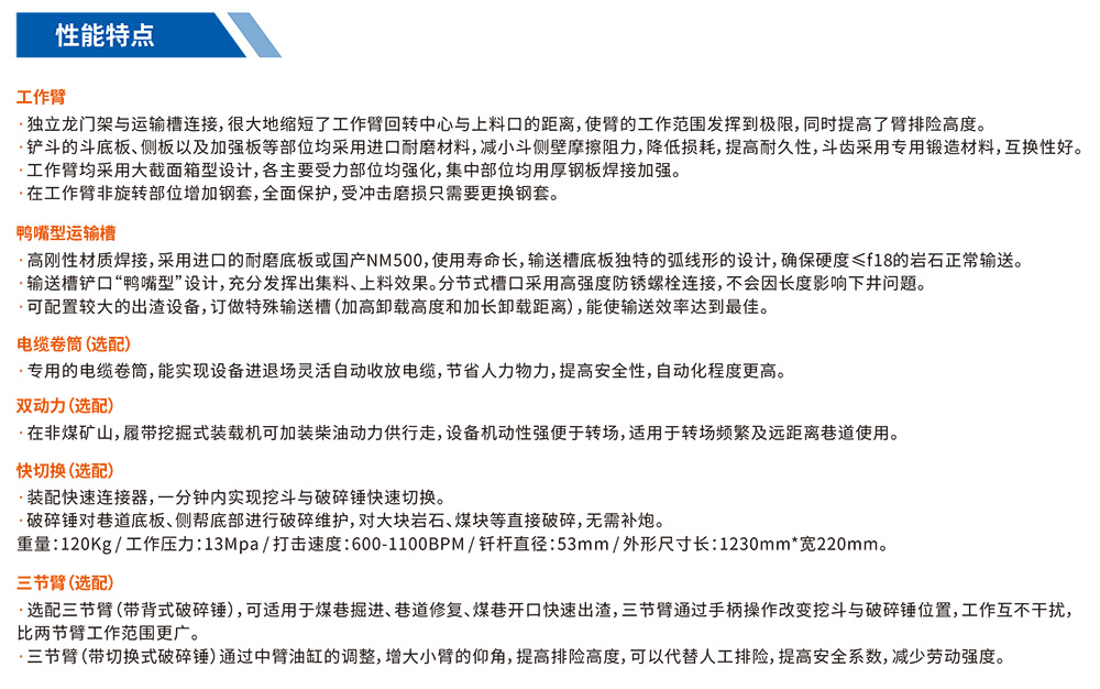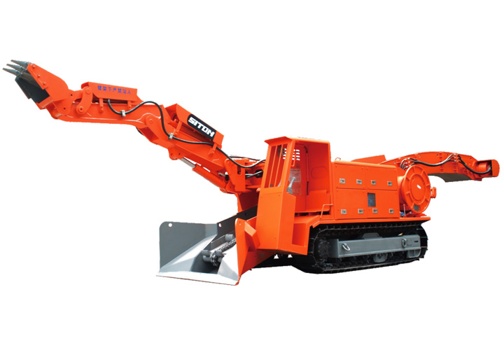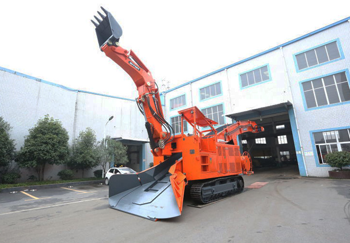 履带挖掘式装载机是一种连续生产的高效率出渣设备。主要用于铁路、公路隧道及煤矿引水洞、国防洞窟掘进施工中装载作业。本机靠履带推进扒取岩石,通过反铲机构扒臂扒取远处的岩石进自身的刮板输送机,输送机从尾部将岩石卸入自卸汽车、梭式矿车、侧卸式矿车、皮带机等其它转载设备。