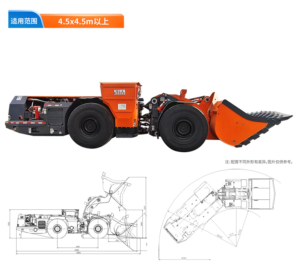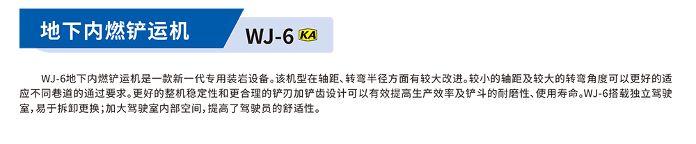 WJ-6地下内燃铲运机是一款新一代专用装岩设备。该机型在轴距、转弯半径方面有较大改进。较小的轴距及较大的转弯角度可以更好的适应不同巷道的通过要求。更好的整机稳定性和更合理的铲刃加铲齿设计可以有效提高生产效率及铲斗的耐磨性、使用寿命。WJ-6搭载独立驾驶室,易于拆卸更换;加大驾驶室内部空间,提高了驾驶员的舒适性。