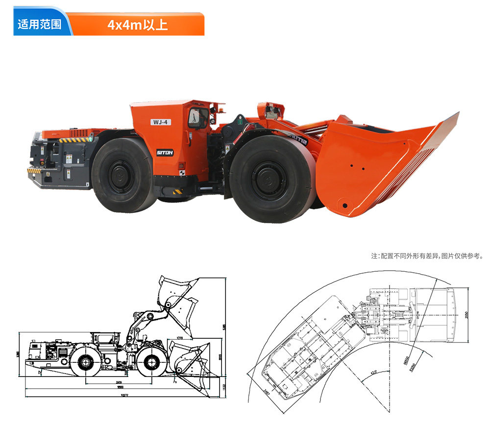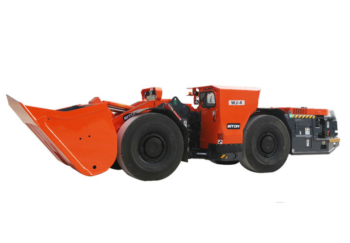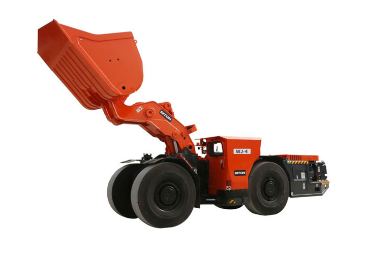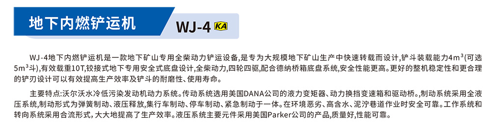 WJ-4地下内燃铲运机是一款地下矿山专用全柴动力铲运设备,是专为大规模地下矿山生产中快速转载而设计,铲斗装载能力4m*(可选5m'斗),有效载重10T,铰接式地下专用安全式底盘设计,全柴动力,四轮四驱,配合德纳桥箱底盘系统,安全性能更高。更好的整机稳定性和更合理的铲刃设计可以有效提高生产效率及铲斗的耐性、使用寿命。主要特点:沃尔沃水冷低污染发动机动力系统。传动系统选用美国DANA公司的液力变矩器、动力换挡变速箱和驱动桥。,制动系统采用全液压系统,制动形式为弹簧制动、液压释放,集行车制动、停车制动、紧急制动于一体。在环境恶劣、高含水、泥泞巷道作业时安全可靠。工作系统和转向系统采用合流形式,大大地提高了生产效率。液压系统主要元件采用美国Parker公司的产品,质量好,性能可靠。