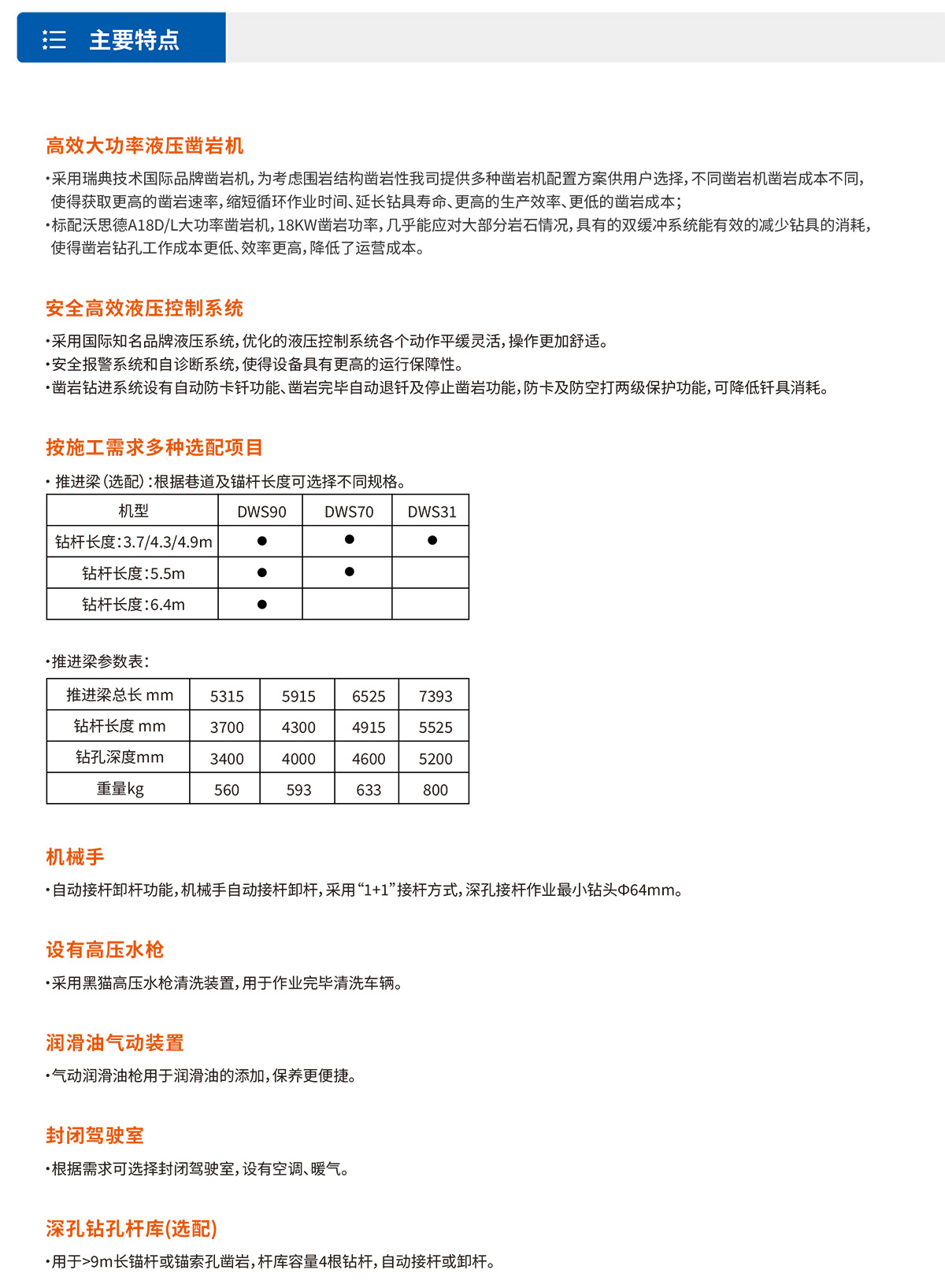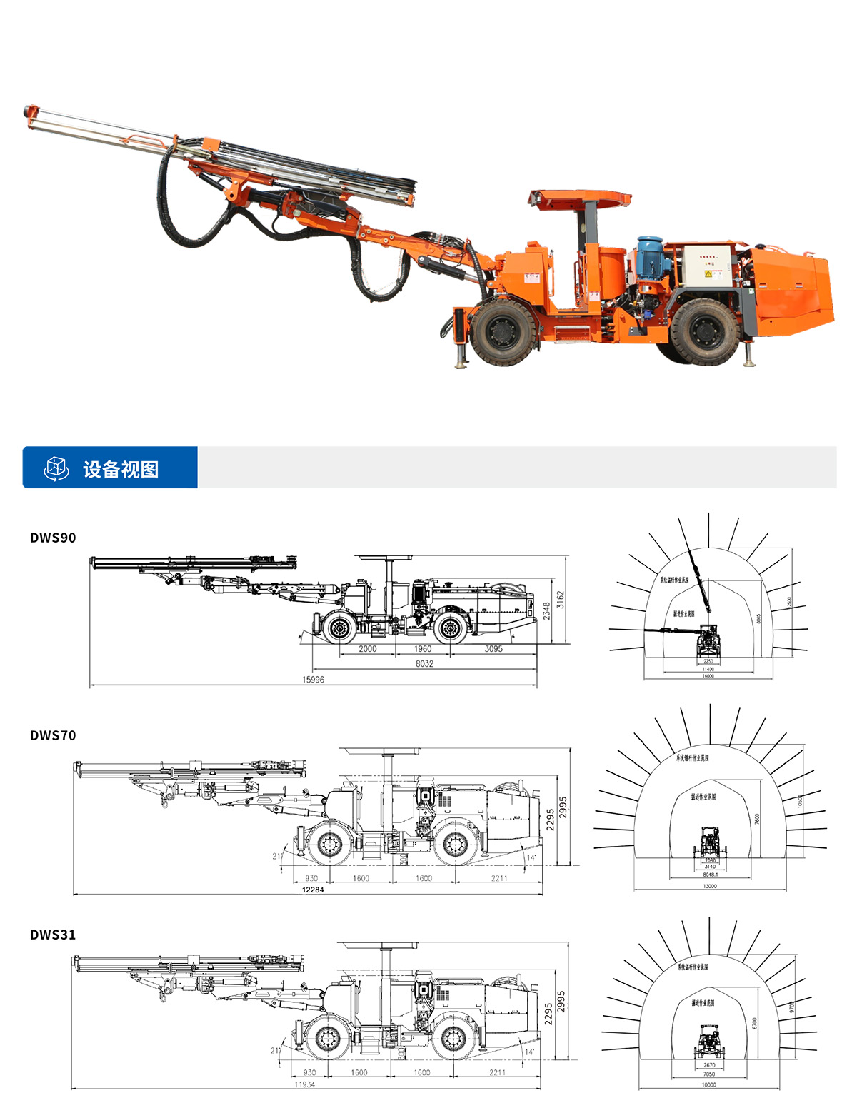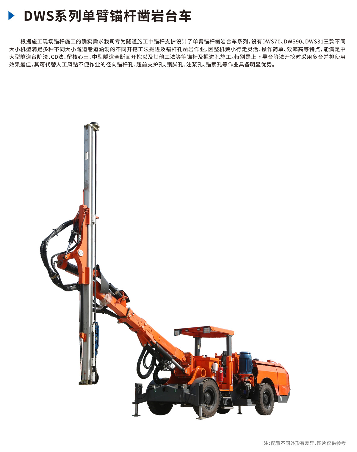 根据施工现场锚杆施工的确实需求我司专为隧道施工中锚杆支护设计了单臂锚杆凿岩台车系列,设有DWS70、DWS90、DWS31三款不同大小机型满足多种不同大小隧道巷道涵洞的不同开挖工法掘进及锚杆孔凿岩作业,因整机狭小行走灵活、操作简单等特点,能满足中大型隧道台阶法、CD法、留核心土、中型隧道全断面开挖以及其他工法等等锚杆及掘进孔施工。特别是上下导台阶法开挖时采用多台并排使用,其可代替人工风钻不便作业的径向锚杆孔、超前支护孔、锁脚孔、注浆孔、锚索孔等作业具备明显优势。