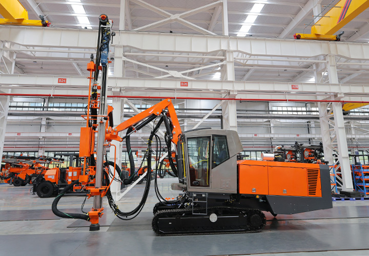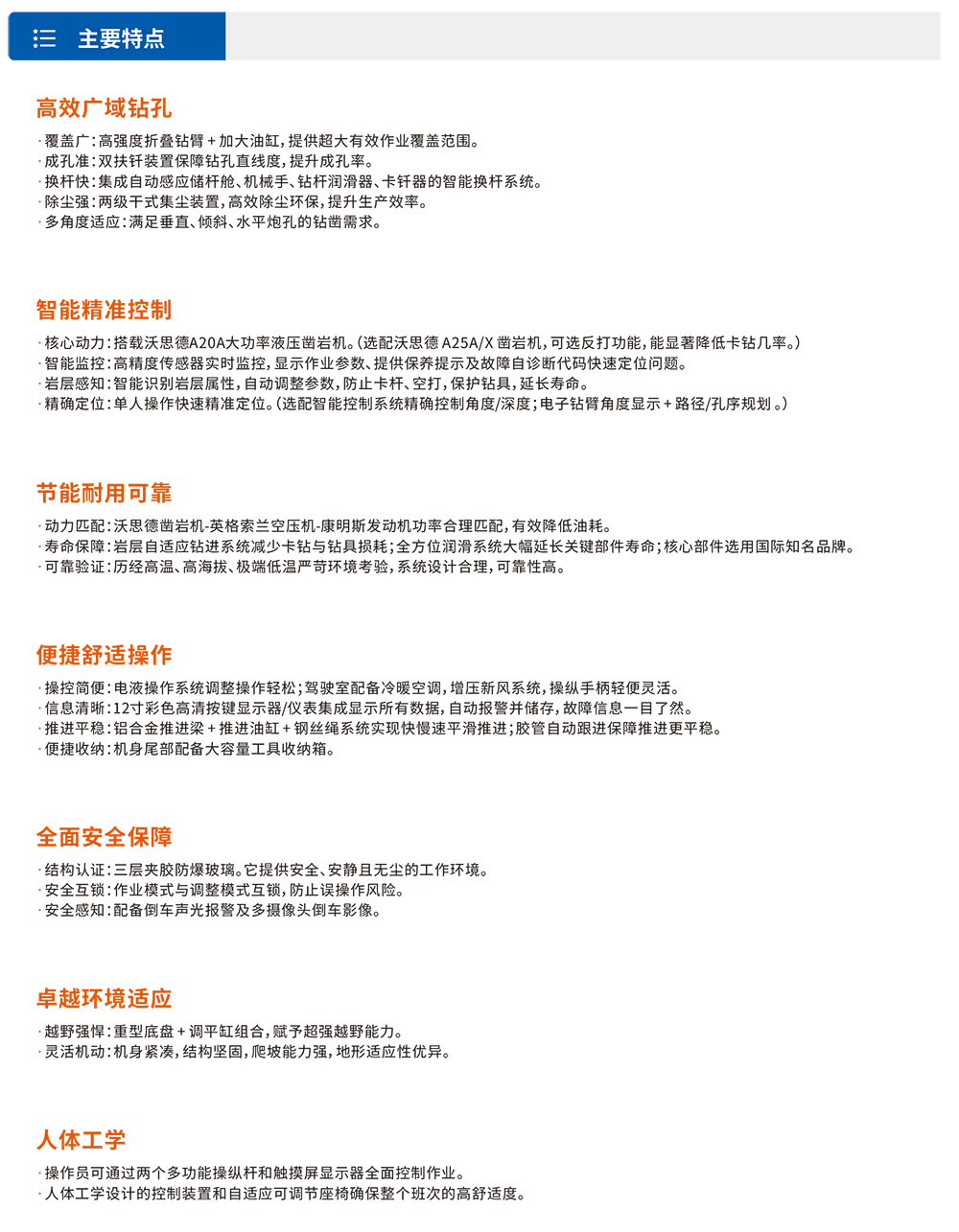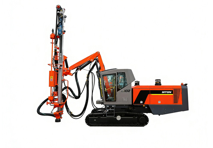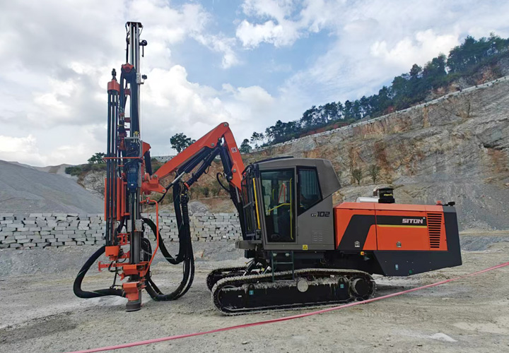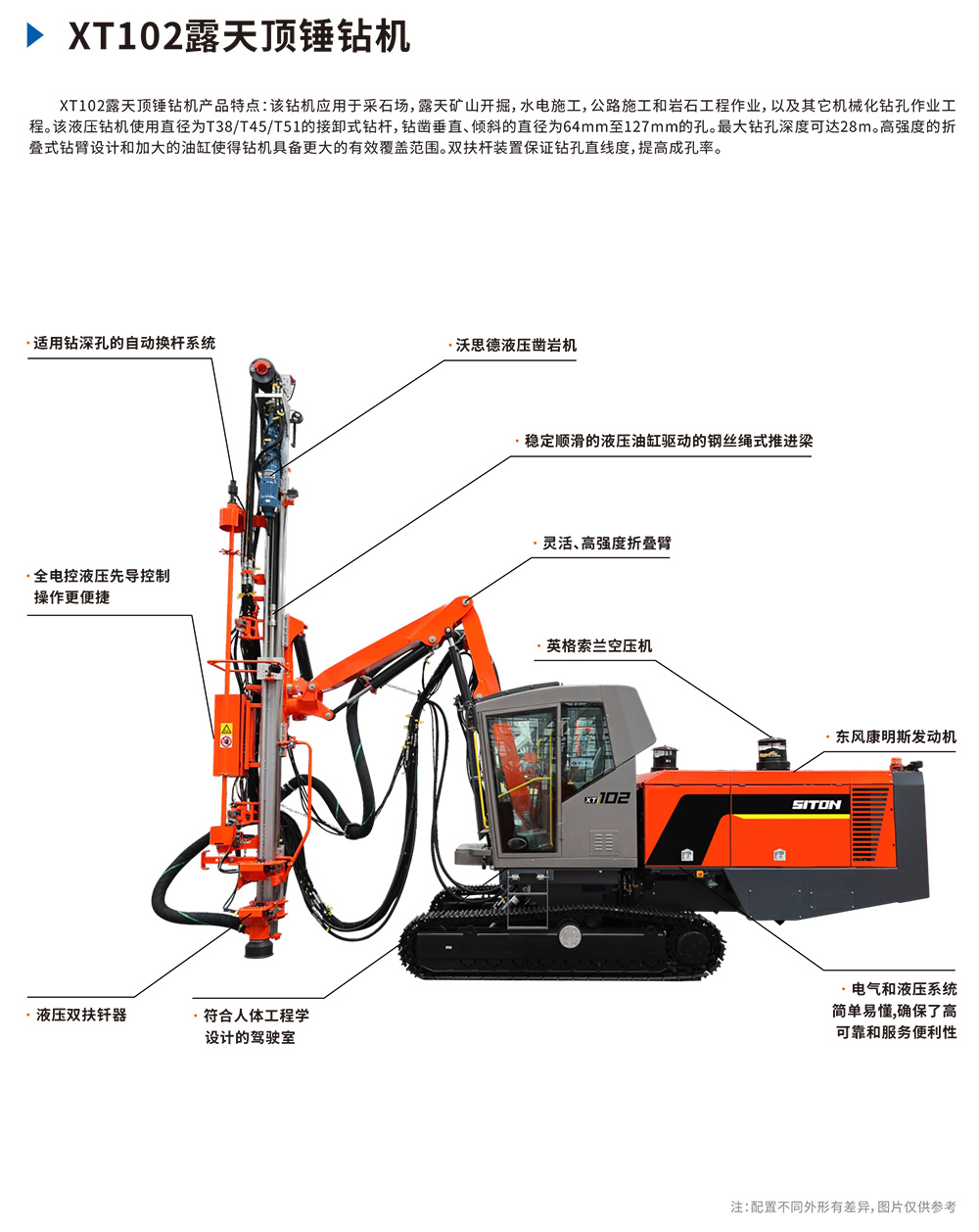 XT102露天顶锤钻机产品特点:该钻机应用于采石场,露天矿山开掘,水电施工,公路施工和岩石工程作业,以及其它机械化钻孔作业工程。该液压钻机使用直径为T38/T45/T51的接卸式钻杆,钻凿垂直、倾斜的直径为64mm至127mm的孔。最大钻孔深度可达28m。高强度的折叠式钻臂设计和加大的油缸使得钻机具备更大的有效覆盖范围。双扶杆装置保证钻孔直线度,提高成孔率。