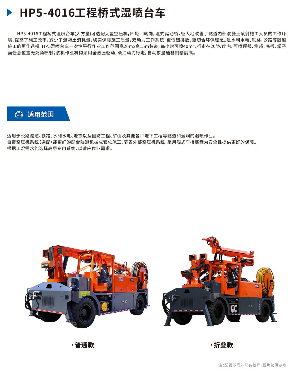 HP5-4016⼯程桥式湿喷台⻋(⼤⽅量)可选配⼤型空压机,四轮四转向,湿式驱动桥,极⼤地改善了隧道内部混凝⼟喷射施⼯⼈员的⼯作环境,提⾼了施⼯效率,减少了混凝⼟消耗量,切实保障施⼯质量,双动⼒⼯作系统,更低碳排放,更切合环保理念。是⽔利⽔电、铁路、公路等隧道施⼯的更佳选择。HP5湿喷台⻋⼀次性平⾏作业⼯作范围宽26mx⾼15m巷道,每⼩时可喷40m³,⾏⾛在20°坡度内、可喷顶邦、侧邦、底板、掌⼦⾯任意位置⽆死⻆喷射;该机作业机构采⽤全液压驱动,柴油动⼒⾏⾛,⾃动掺量速凝剂精度⾼。