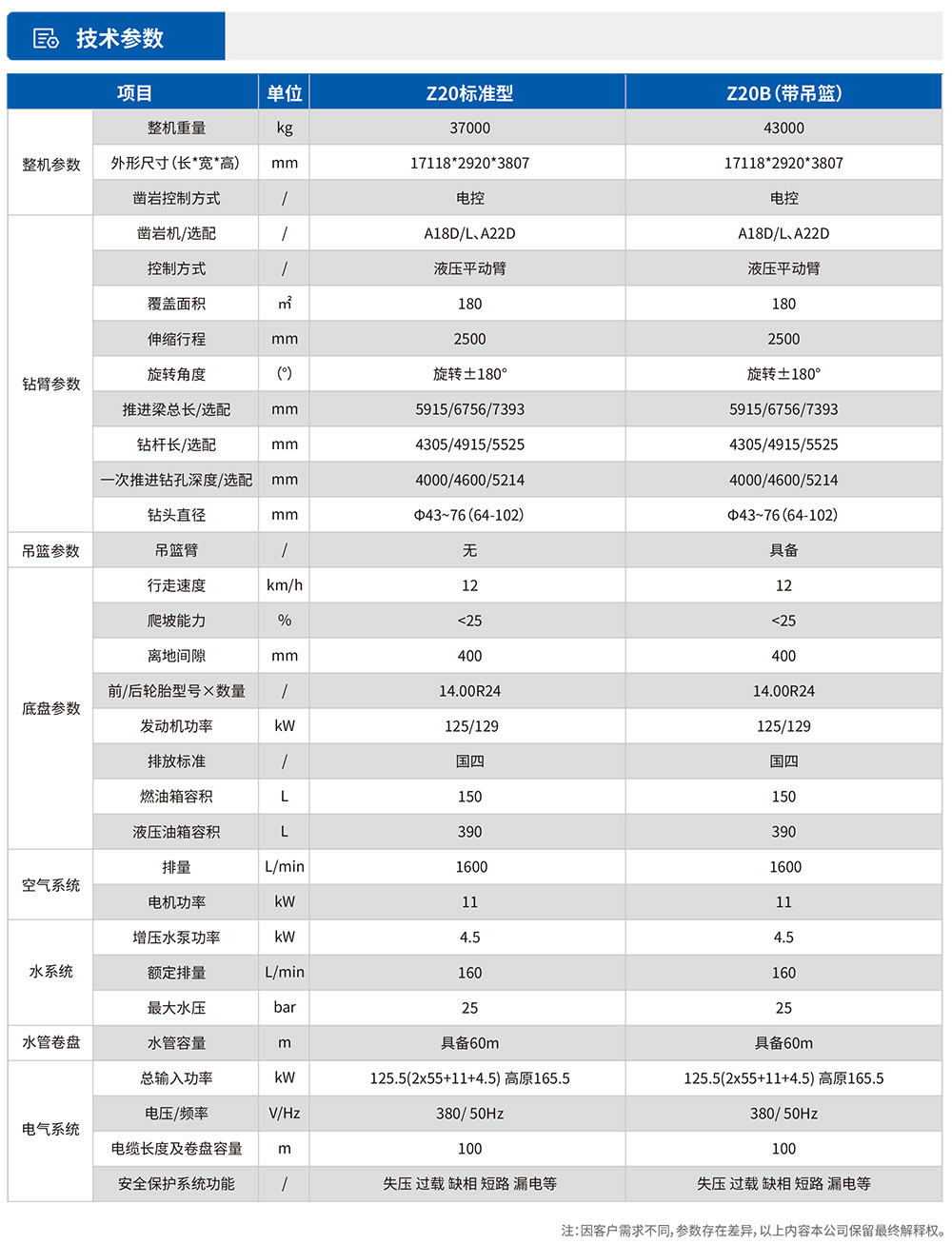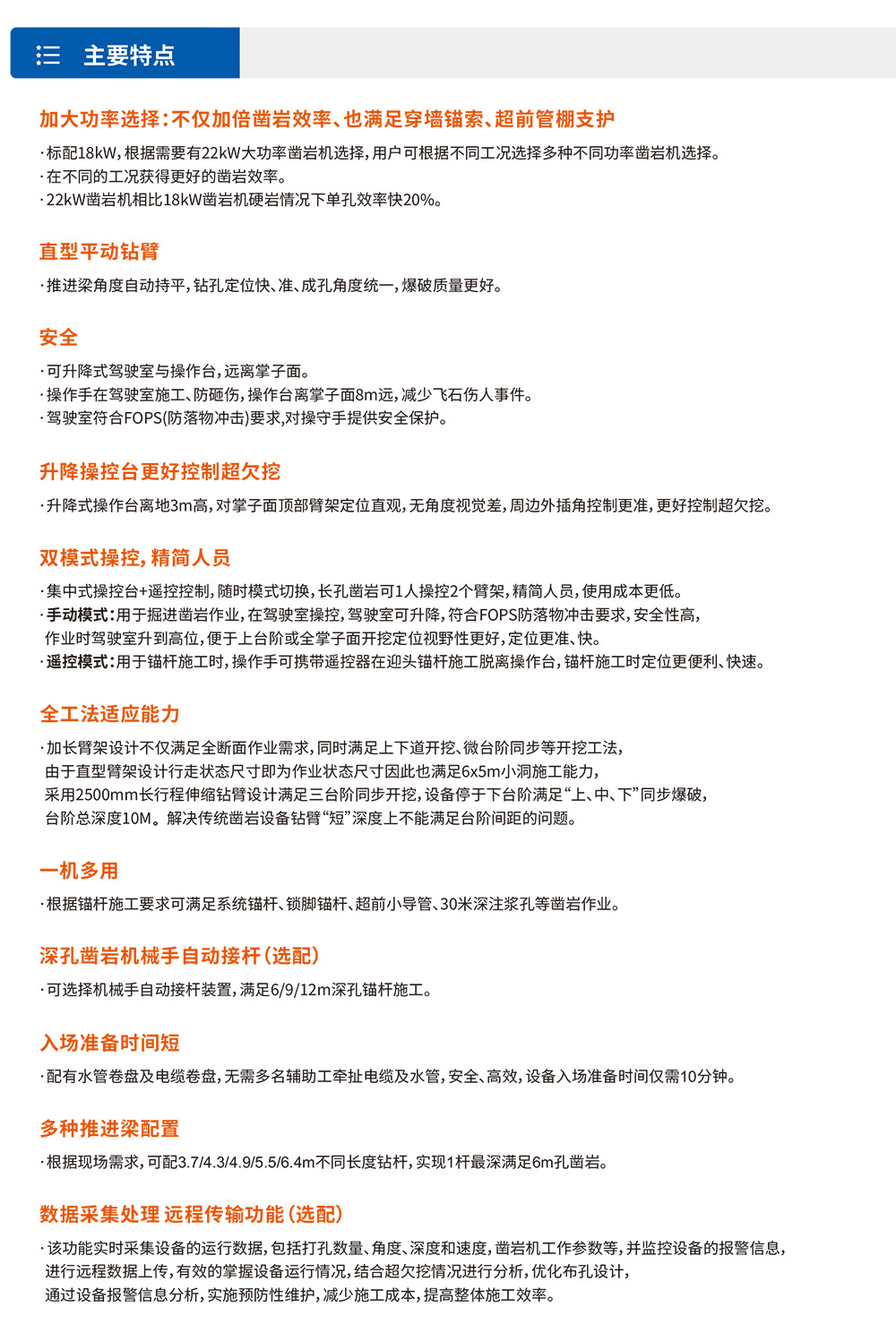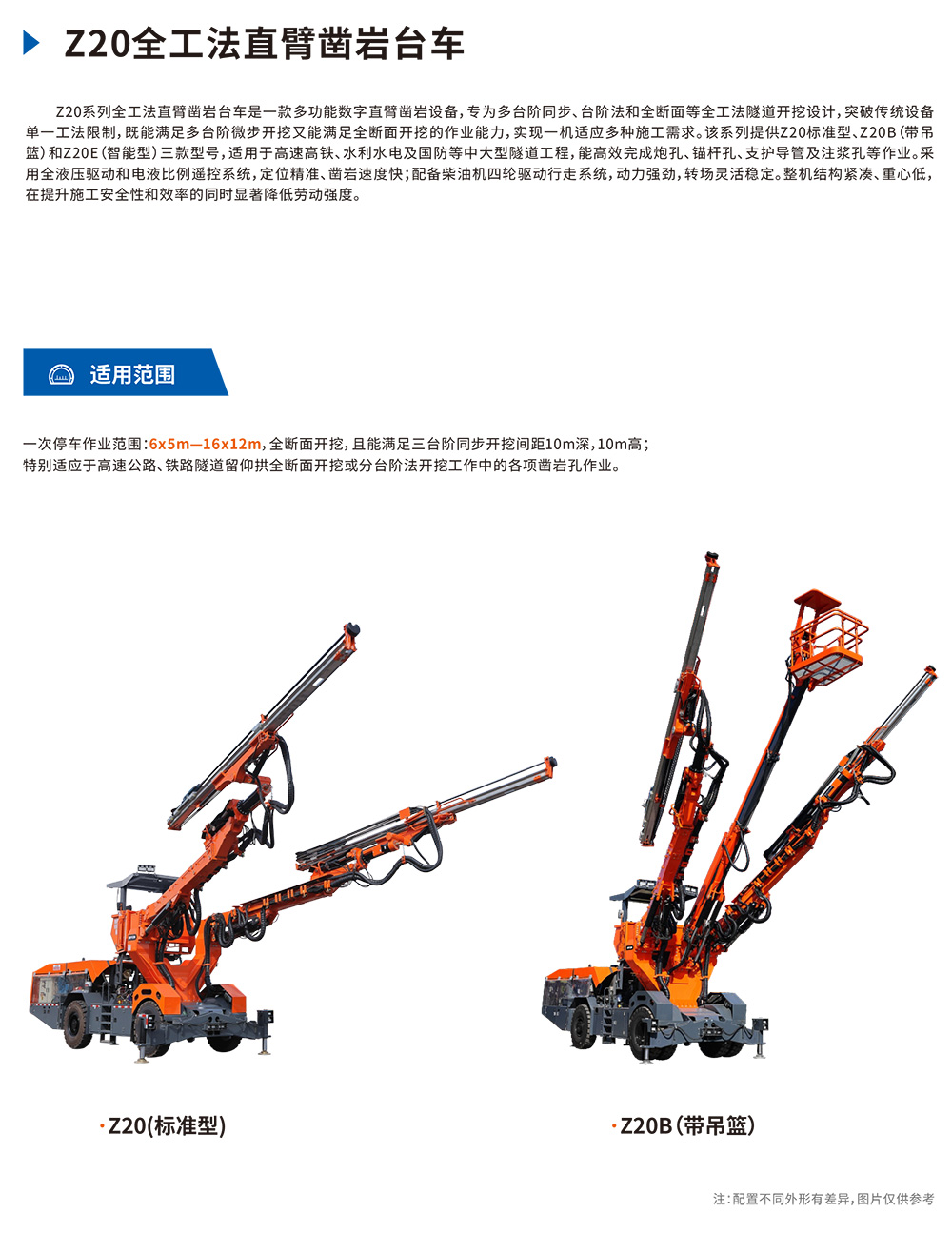 Z20系列全⼯法直臂凿岩台⻋是⼀款多功能数字直臂凿岩设备,专为多台阶同步、台阶法和全断⾯等全⼯法隧道开挖设计,突破传统设备单⼀⼯法限制,既能满⾜多台阶微步开挖⼜能满⾜全断⾯开挖的作业能⼒,实现⼀机适应多种施⼯需求。该系列提供Z20标准型、Z20B(带吊篮)和Z20E(智能型)三款型号,适⽤于⾼速⾼铁、⽔利⽔电及国防等中⼤型隧道⼯程,能⾼效完成炮孔、锚杆孔、⽀护导管及注浆孔等作业。采⽤全液压驱动和电液⽐例遥控系统,定位精准、凿岩速度快;配备柴油机四轮驱动⾏⾛系统,动⼒强劲,转场灵活稳定。整机结构紧凑、重⼼低,在提升施⼯安全性和效率的同时显著降低劳动强度。