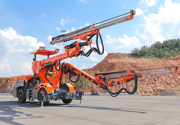 DW2-180鹰式臂全工序双臂(液压)凿岩台车为多台阶同步及全断面开挖而设计的一款满足全工法开挖施工凿岩设备,为满足多台阶同步开挖而设计研发。采用加长型鹰式钻臂设计解决了传统凿岩台车因一条隧道的开挖涉及多种工法而不能同时满足所有工法施工需求的缺陷。实现多台阶同步开挖、全断面开挖的问题,能满足导洞小巷道的开挖,使设备适应开挖工法及工况更广泛,采用两套钻臂独立液压系统控制互不干涉,钻臂可伸缩覆盖面积广,设有一套高空服务吊篮可为装药、排险、挂网等辅助工作提供升降平台。为高速高铁、水利水电工程、以及国防等中大型隧道掘进钻孔作业而研发制造的凿岩装备,满足凿岩掘进需要的各种炮孔、锚杆孔、小导管支护、注浆孔等,该机工作时采用全液压驱动,电液比例阀控系统控制钻臂凿岩,动作柔顺定位迅速、凿岩速度快,柴油机供行走,四轮四驱、转场灵活,整机结构布置紧凑、重心低、机动灵活、系统稳定,不仅提升安全保障和工作效率,也能降低劳动者的工作强度。