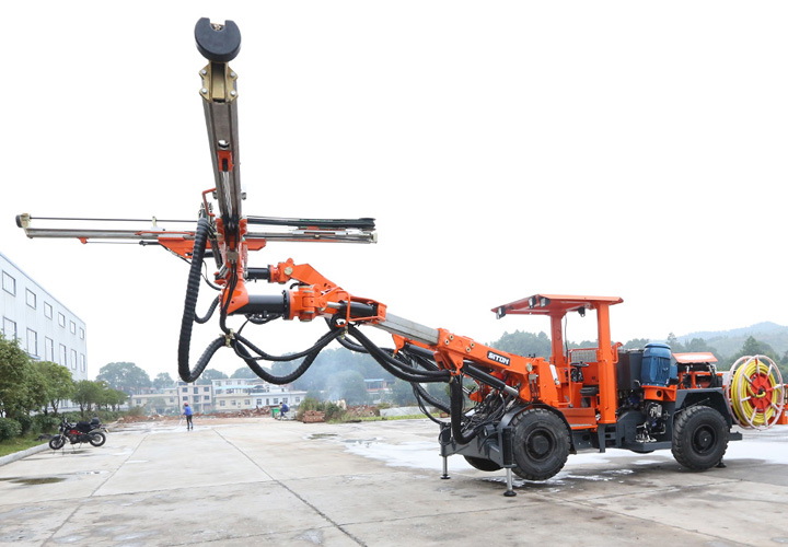 DW2-50双臂凿岩台车是一款双臂矿用液压掘进钻车,为中小型巷道钻孔而设计研发,该机设有2套独立的全液压驱动凿岩系统,互不影响,配备大功率凿岩机,凿岩速度可达0.8-2.5米/分钟,适应围岩等级范围广,配有完全液压平动可伸缩式钻臂,适应于巷道8.5m宽x6.8m高以下巷道作业,柴油机四轮驱动轮胎式饺接底盘,全湿式车桥底盘系统双路制动控制系统,安全可靠性高,爬坡能力 14°(25%),行走速度16km/h。