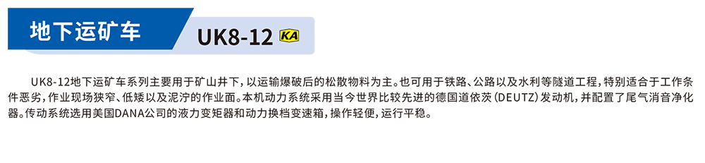 UK8-12地下运矿车系列主要用于矿山井下,以运输爆破后的松散物料为主。也可用于铁路、公路以及水利等隧道工程,特别适合于工作条件恶劣,作业现场狭窄、低矮以及泥泞的作业面。本机动力系统采用当今世界比较先进的德国道依茨(DEUTZ)发动机,并配置了尾气消音净化器。传动系统选用美国DANA公司的液力变矩器和动力换档变速箱,操作轻便,运行平稳。