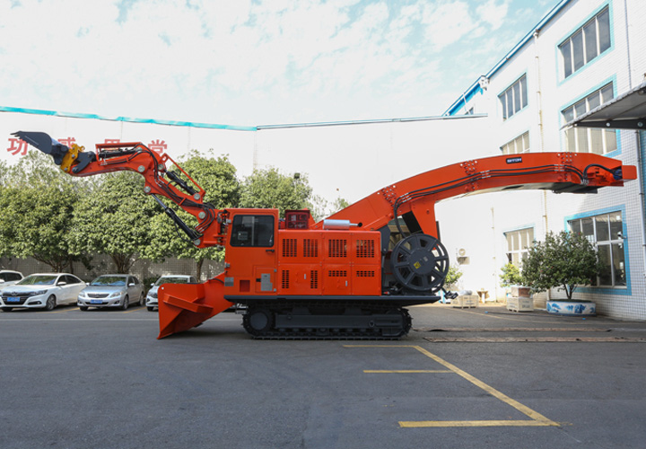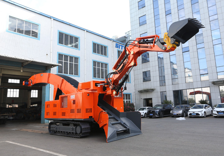中大型履带式挖掘装载机(扒渣机)主要以180-360型为主,为大型地下隧道如引水、国防、高速或高铁辅助隧道快速装载而设计研发,装载连续性较强等特点, 设有大坡度专用机型、双动力、高原用等多种功能机型可选择。可以全断面工作,不留死角,无需人工辅助清理工作面。运渣采用链条刮板式,输送运转平稳,排渣能力强,且采用半封闭式装配方式,维护方便。