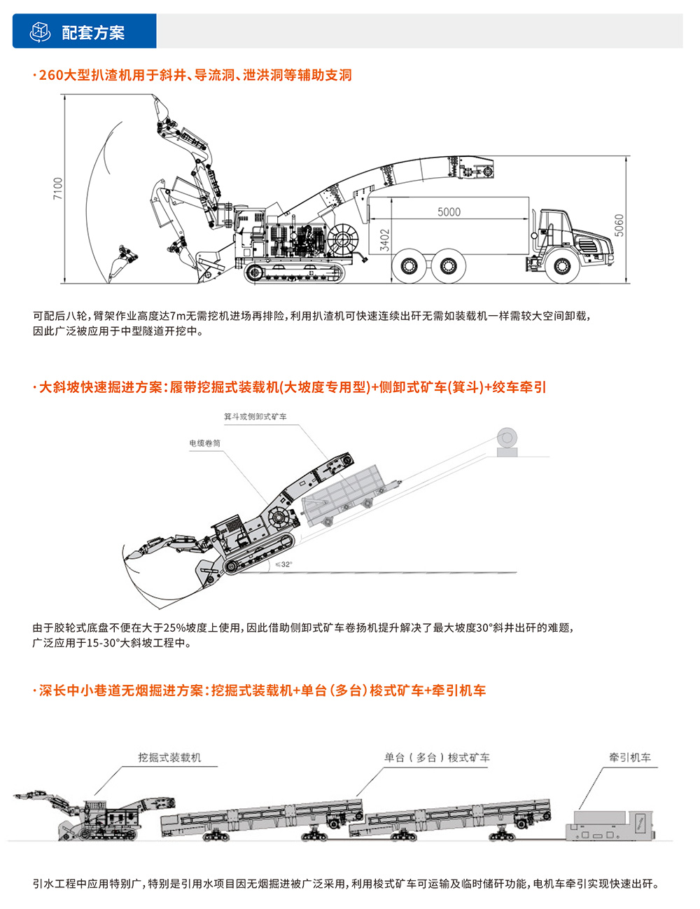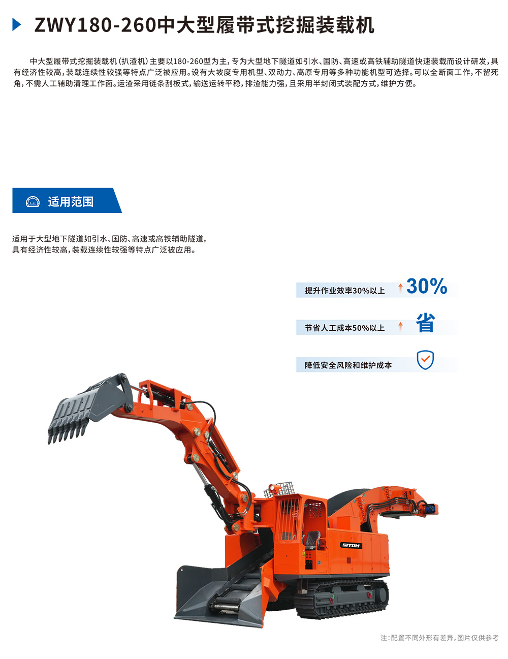 中⼤型履带式挖掘装载机(扒渣机)主要以180-260型为主,专为⼤型地下隧道如引⽔、国防、⾼速或⾼铁辅助隧道快速装载⽽设计研发,具有经济性较⾼,装载连续性较强等特点⼴泛被应⽤。设有⼤坡度专⽤机型、双动⼒、⾼原专⽤等多种功能机型可选择。可以全断⾯⼯作,不留死⻆,不需⼈⼯辅助清理⼯作⾯。运渣采⽤链条刮板式,输送运转平稳,排渣能⼒强,且采⽤半封闭式装配⽅式,维护⽅便。