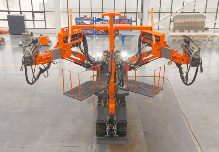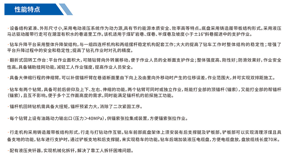 煤矿用液压锚杆钻车是我公司对掘进工作面高度范围3.5~4.8米的巷道而设计的,并且在结构和功能上采用了整体升降的工作平台,可以根据巷道高度情况通过平台升降使作业人员进行上下调整,从而很方便地实现巷道内不同高度、不同角度锚杆锚索孔、炮眼孔、探测(探水、探瓦斯)孔的机械化作业施工。该设备具有钻进功能全面、安全性好、工作效率高、工人劳动强度低等特点,尤其是工人在使用其进行锚杆锚索支护作业时能大大缩短支护作业时间,提高支护效率和支护质量。该设备结构合理、机构紧凑、运转灵活、操作方便,是实现目前国内巷道掘进支护快速。高效、机械化的首选装备。