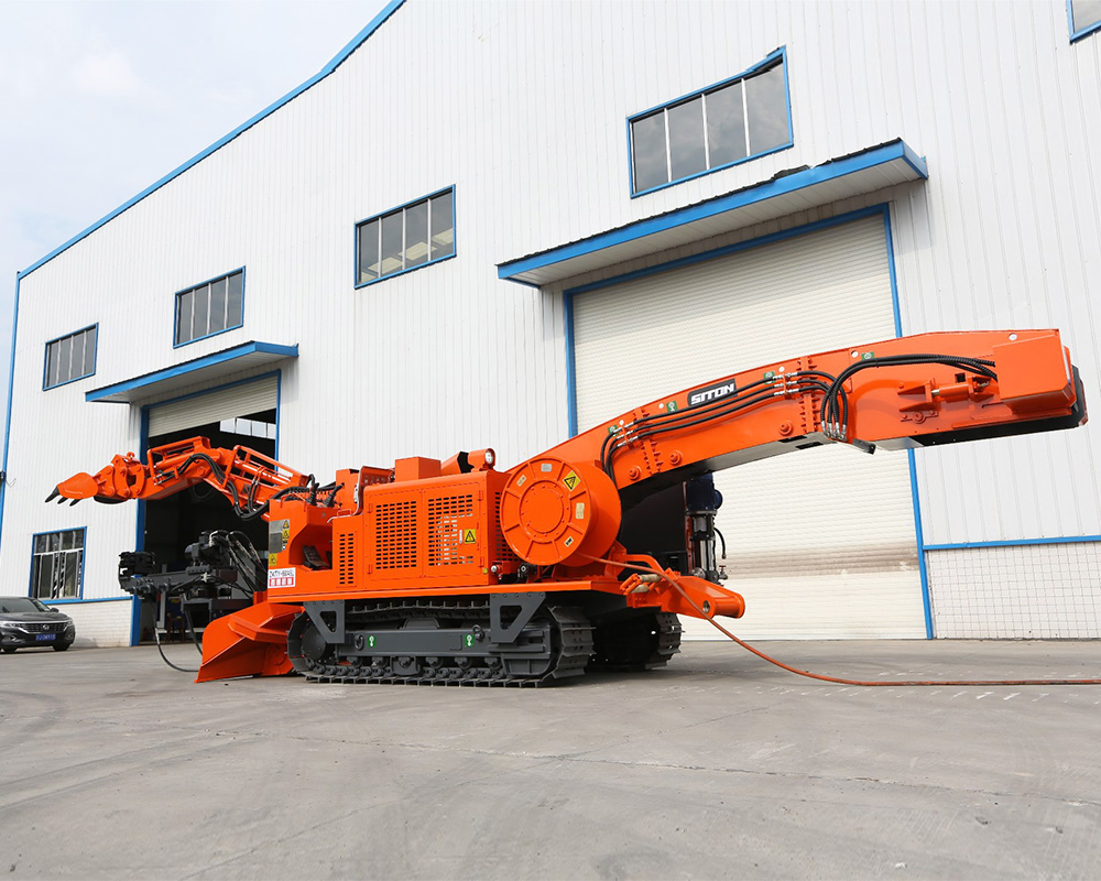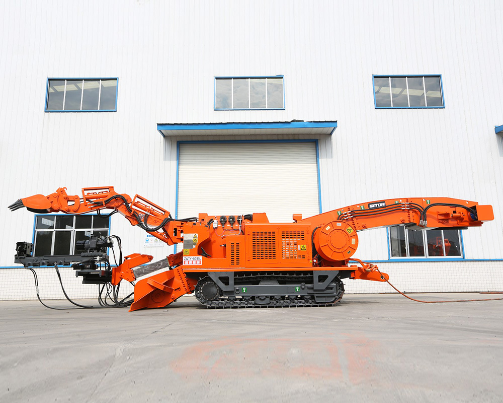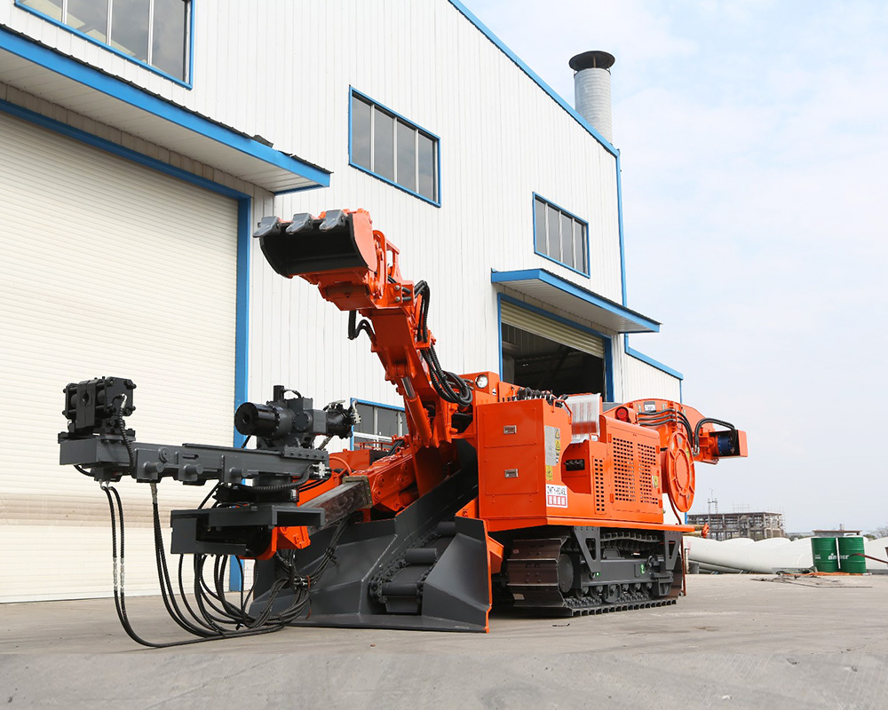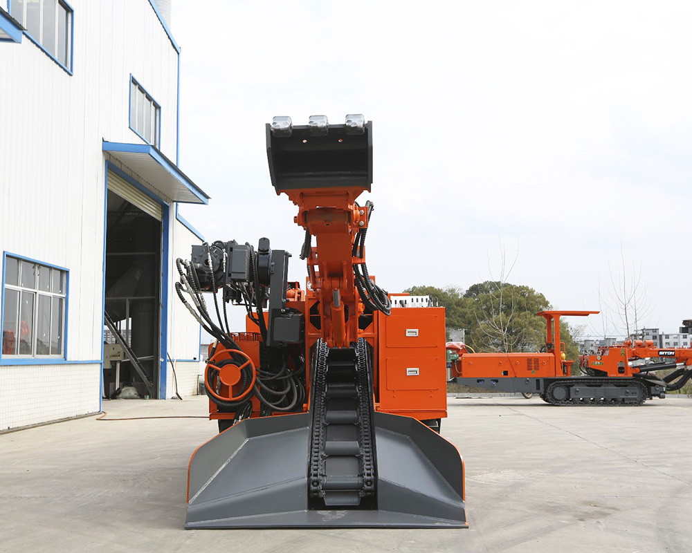 CZWTY-80煤矿用挖装探机组是一种集装载、钻探两种功能于一体的作业装备。用于矿山岩巷、引水洞以及其它工程巷道中的掘进作业。其应用提高了掘进速度,降低了工人的劳动强度,掘进施工作业提高了安全,很好的实现了岩巷掘进的机械化作业需求。同时解决了中小巷道多种设备错不开车的问题。挖装探机组钻臂可对巷道迎头工作面钻探测孔,也可以钻瓦斯释放孔。反铲机构扒臂扒取远处的岩石,送入刮板运输机,刮板运输机从尾部将岩石卸入矿车或皮带运输机中,也可以用扒斗来清理工作面。