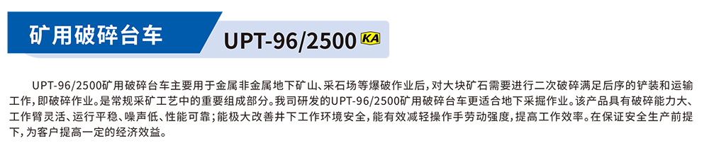 UPT-96/2500矿用破碎台车主要用于金属非金属地下矿山,采石场等爆破作业后,对大块矿石需要进行二次破碎满足后序的铲装和运输工作,即破碎作业。是常规采矿工艺中的重要组成部分。我同研发的UPT-96/2500矿用破碎台车更适合地下采掘作业。该产品具有破碎能力大。工作臂灵活、运行平稳、噪声低、性能可靠;能极大改善井下工作环境安全,能有效减轻操作手劳动强度,提高工作效率。在保证安全生产前报下,为客户提高一定的经济效益。