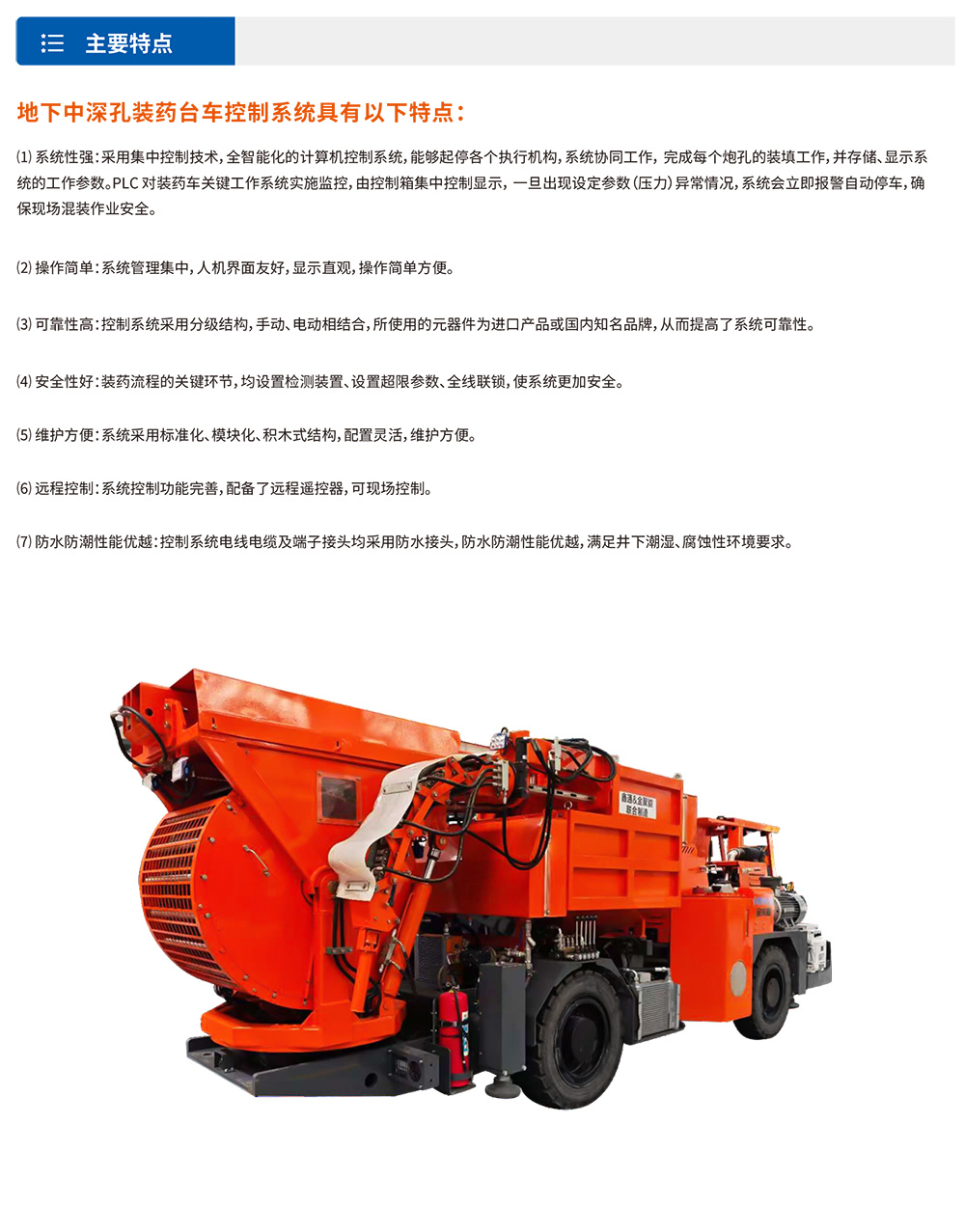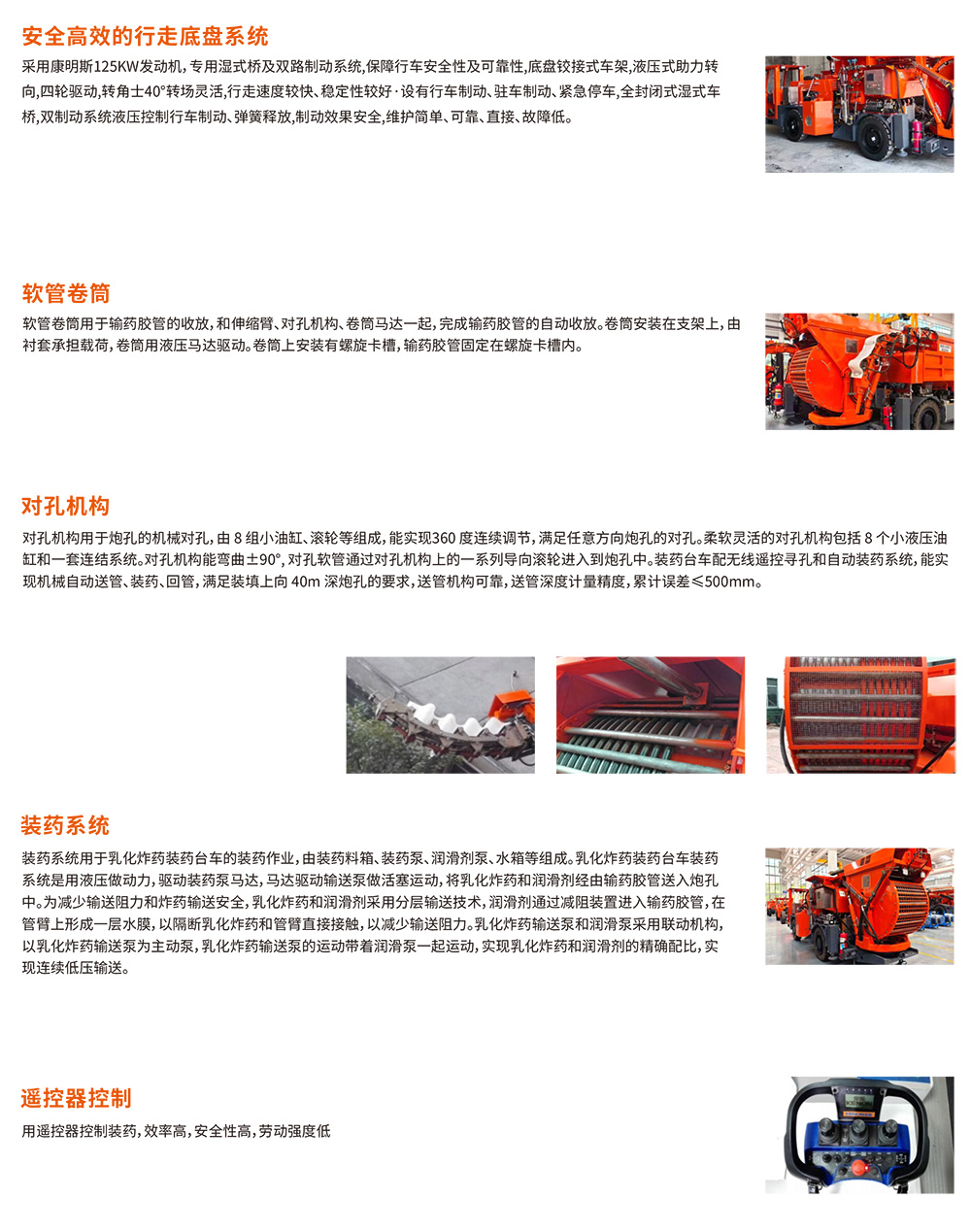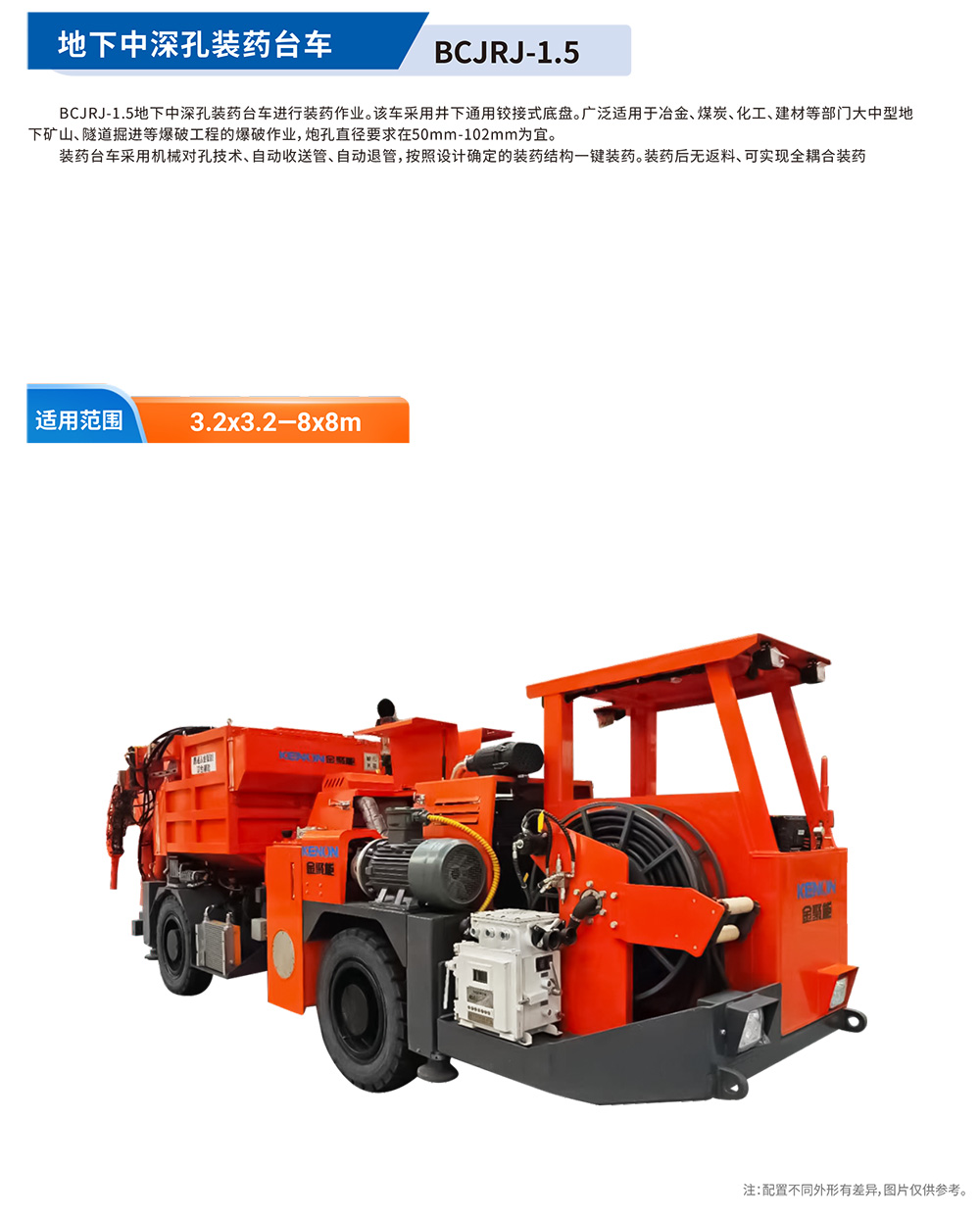 BCJRJ-1.5地下中深孔装药台⻋进⾏装药作业。该⻋采⽤井下通⽤铰接式底盘。⼴泛适⽤于冶⾦、煤炭、化⼯、建材等部⻔⼤中型地下矿⼭、隧道掘进等爆破⼯程的爆破作业,炮孔直径要求在50mm-102mm为宜。装药台⻋采⽤机械对孔技术、⾃动收送管、⾃动退管,按照设计确定的装药结构⼀键装药。装药后⽆返料、可实现全耦合装药