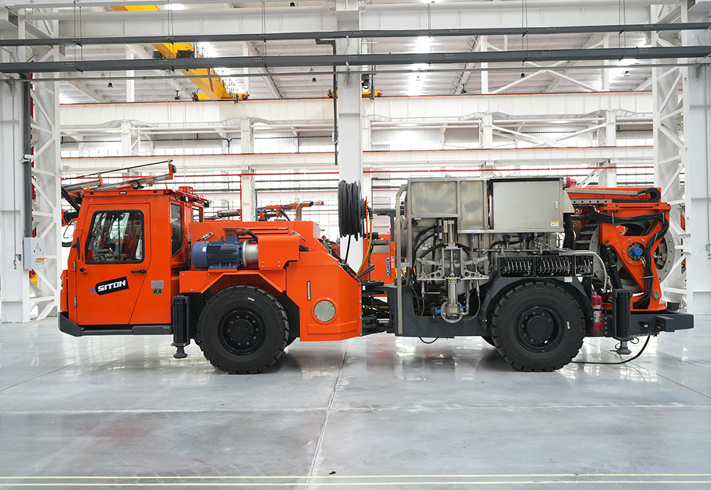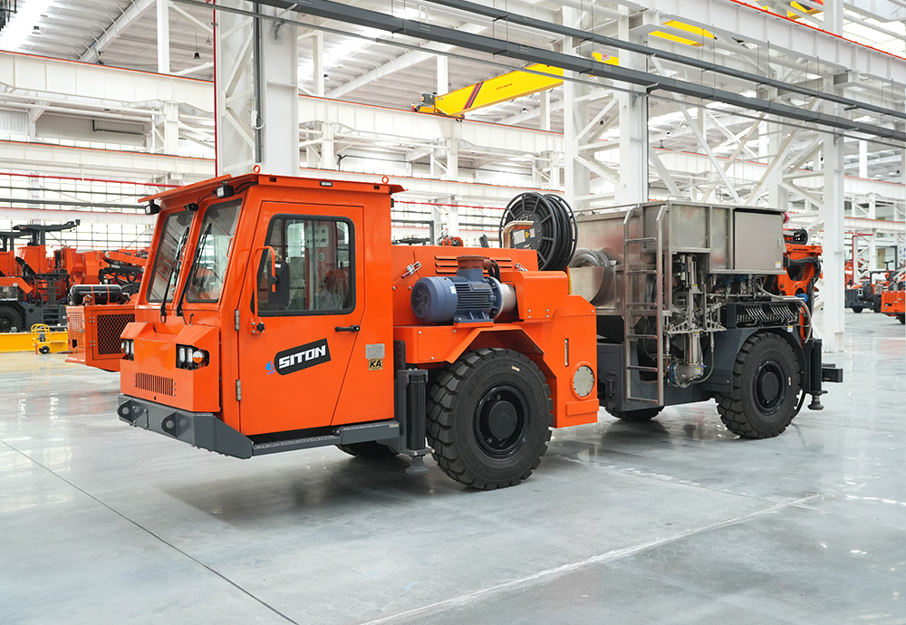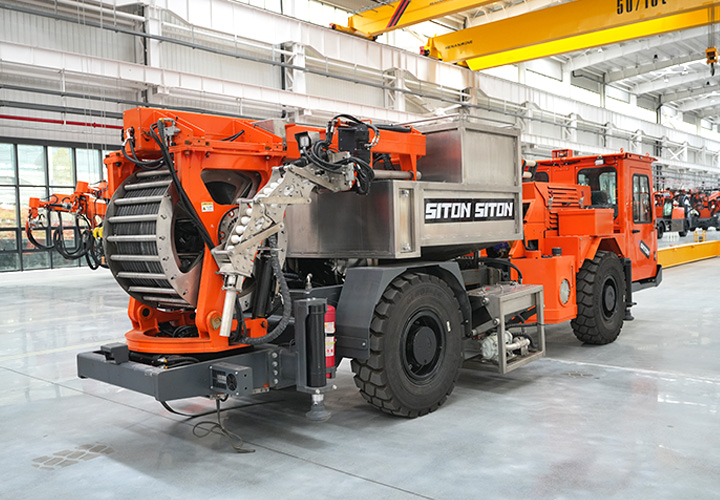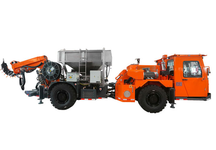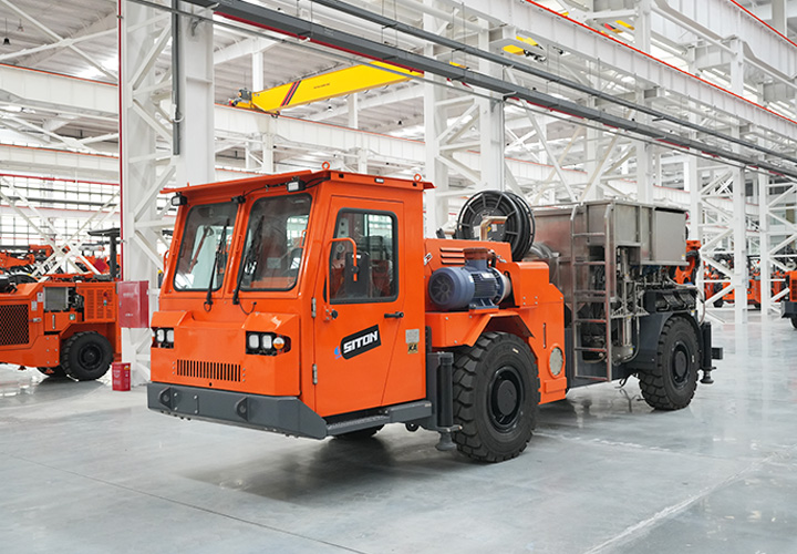 乳化炸药地下装药车既可用于现场混装,也可装散装乳化炸药。乳化炸药地下装药车采用泵送装药工艺在装药爆破现场,将乳化炸药或散装乳化炸药装入炸药料箱,将配好的润滑剂加入润滑剂箱。用输药胶管将起爆弹送至孔底,然后一边装药一边退管。装药全过程的自动化作业,最大装药孔深45米,遥控操作,既可装填散装乳化炸药,也可使用乳胶基质做现场混装,炸药密度可调,威力可调,返药率<1%,作业人员可控制在2人。