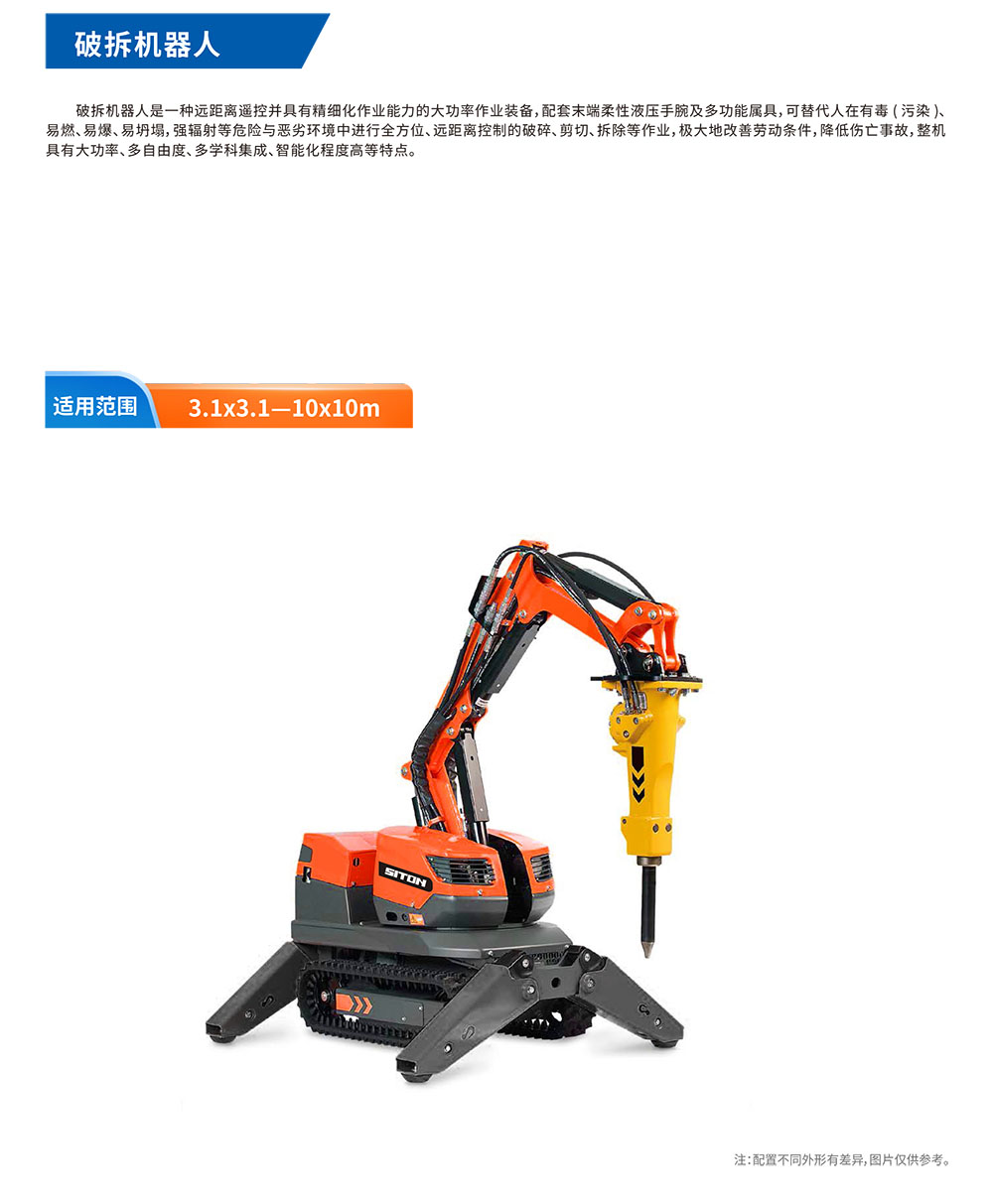破拆机器⼈是⼀种远距离遥控并具有精细化作业能⼒的⼤功率作业装备,配套末端柔性液压⼿腕及多功能属具,可替代⼈在有毒(污染)、易燃、易爆、易坍塌,强辐射等危险与恶劣环境中进⾏全⽅位、远距离控制的破碎、剪切、拆除等作业,极⼤地改善劳动条件,降低伤亡事故,整机具有⼤功率、多⾃由度、多学科集成、智能化程度⾼等特点。
