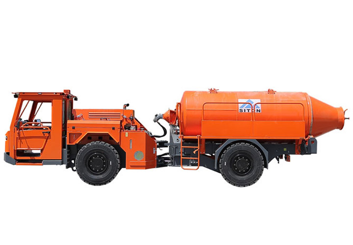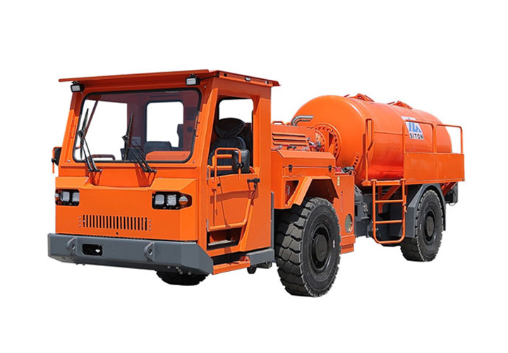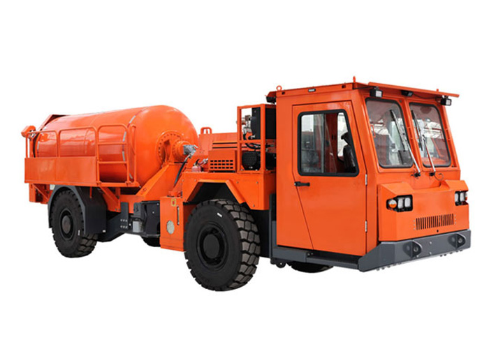 KJCJ-4型矿用混凝土搅拌运输车主要用于井下巷道、隧道工程等硐室快速运输混凝土的专用型设备,基于井下巷道、隧道工况设计,整车机身窄、高度低、车架为中间铰接结构,可在井下巷道、隧道中实现灵活转向,使整车的转弯半径变小。采用大功率发动机全柴动力,国四排放,四档变速,全封闭式湿式车桥四轮四驱,配备5立方大容量罐体,实现硐室快速高效运输混凝土让地下湿喷作业更加高效。