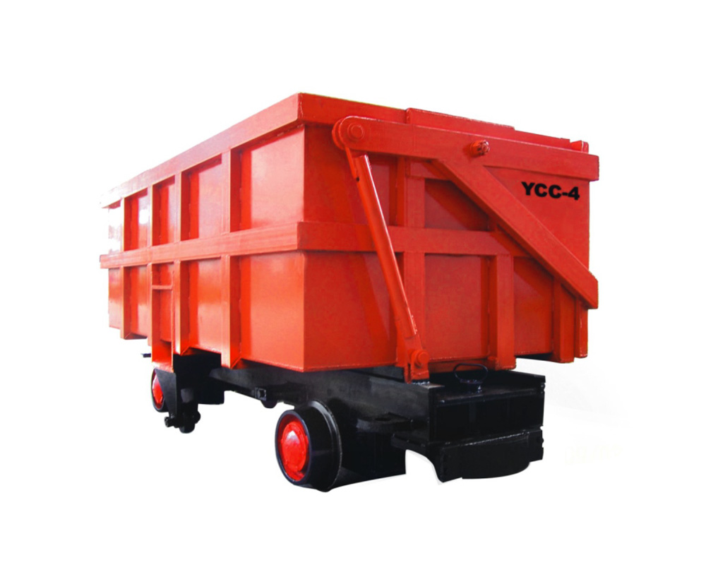 曲轨式侧卸翻斗矿车,是在矿车行进过程中,由卸载轮臂经过卸载曲轨来实现车箱自动倾翻卸料和自动复位,卸矿是在机车牵引下,当卸载轮爬上曲轨时,车箱翻转,车门自动打开实现卸料,车走过曲轨后车箱恢复原位,车门自动锁固。