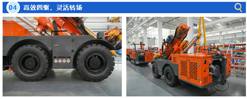 KQDT-125轮胎式矿用潜孔钻机,采用潜孔冲击器作业,闭式四驱液压系统。适用于地下采场环形孔的穿凿、天井/斜井开凿、回采作业等全场景钻孔作业。