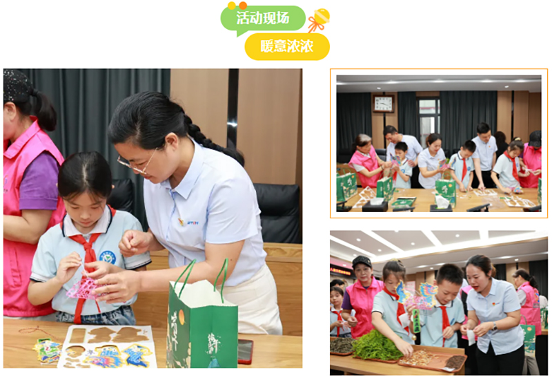江西鑫通的爱心团队与孩子们围坐一起,手把手指导制作端午香包,缕缕药香中流淌着节日的温馨与陪伴的喜悦。