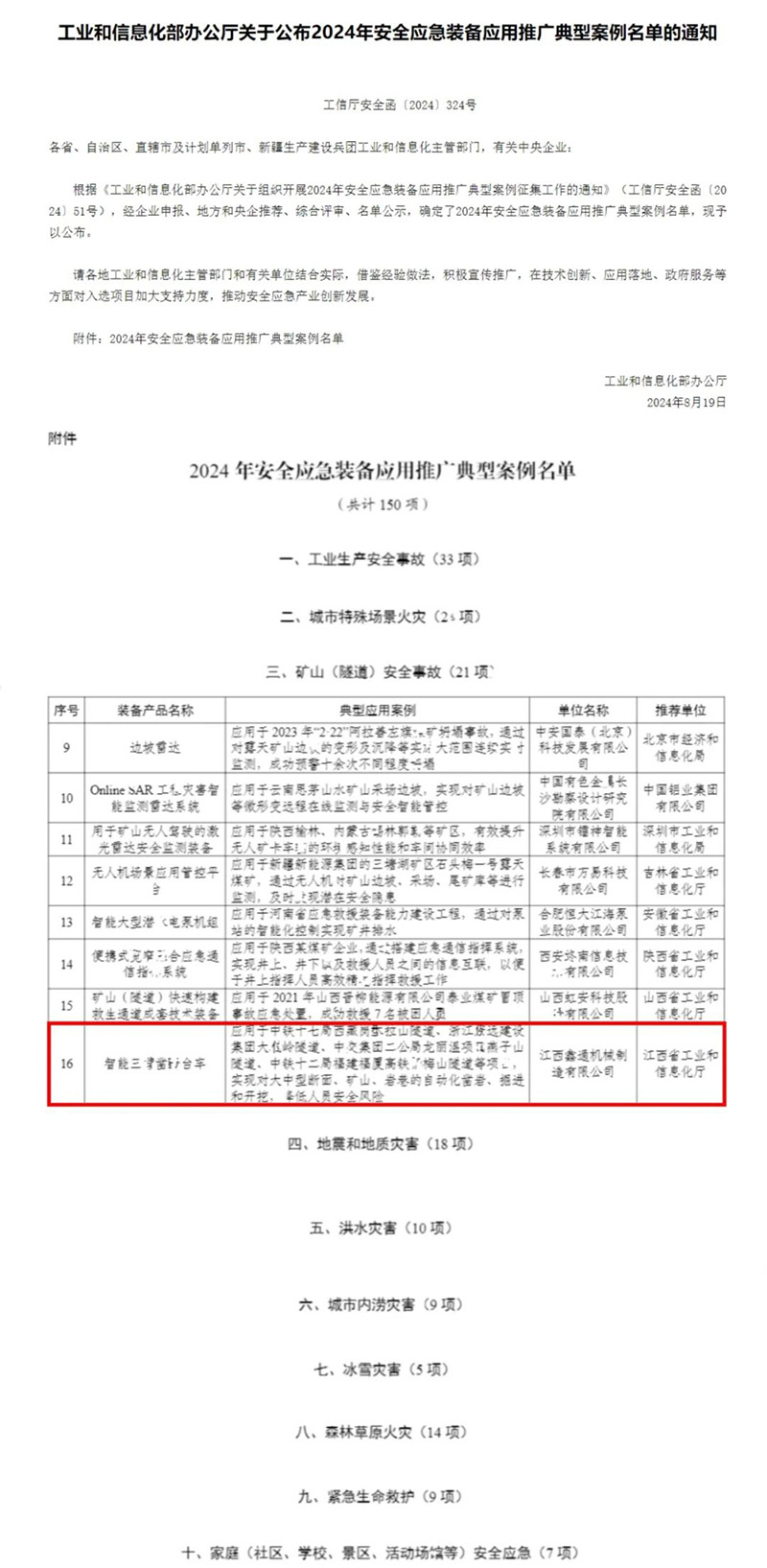 近日,国家工业和信息化部办公厅公布了《2024年安全应急装备应用推广典型案例》名单,江西鑫通智能三臂凿岩台车(DW3-180E)成功入选,成为全省唯一入选“矿山(隧道)安全事故”板块的典型案例。